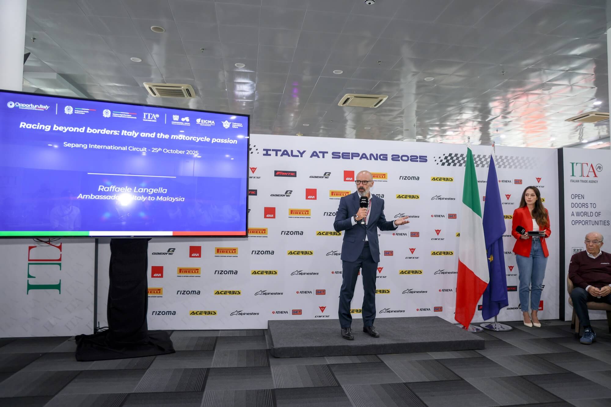 La giornata è iniziata alle 9.00 con il business matching svoltosi all’interno dell’area privata ITA presso il MotoGP VIP Village. Qui le diverse parti coinvolte si sono incontrate, con appuntamenti programmati, per confrontarsi e stabilire nuovi rapporti. Al termine della giornata si è svolto l’evento “Racing beyond borders: Italy and the motorcycle passion’’ avviato da Carmelo Ezpeleta, CEO di Dorna Sports, e che ha visto gli interventi di Matteo Zoppas (Presidente ICE), Giovanni Copioli (Presidente FMI), Raffaele Langella (Ambasciatore d’Italia in Malesia) e Mariano Roman (Presidente ANCMA), che hanno presentato ai partecipanti le opportunità offerte dalla filiera italiana e la sua organizzazione.