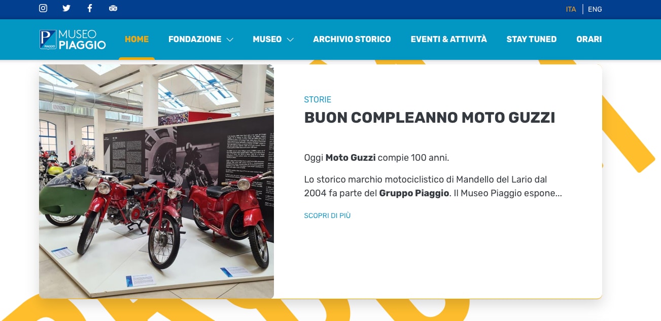 Inoltre, per accontentare le richieste delle migliaia di visitatori che ogni anno popolano le sue grandi sale, il Museo Piaggio è ora visitabile anche on line grazie al Tour Virtuale che “parte” dalla home page MUSEOPIAGGIO.COM e dalle pagine web VESPA.COM e PIAGGIO.COM