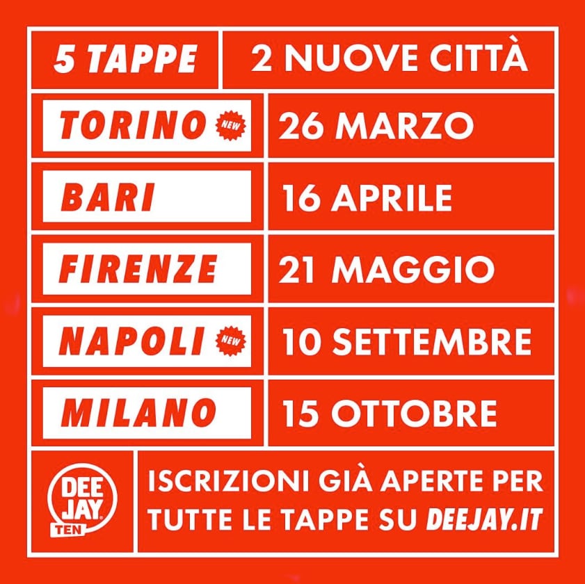 Le tappe dell’edizione 2023. “Torino e Napoli sono le grandi novità del 2023 e si correranno rispettivamente il 26 marzo e il 10 settembre. Confermate anche le tappe di Bari il 16 aprile, Firenze il 21 maggio e il gran finale a Milano il 15 ottobre. La Deejay Ten ogni anno vi racconta quanto la corsa sia divertente, una sintesi perfetta di tutto il bello di faticare insieme, ognuno con il suo ritmo, ma sempre con il sorriso. Non ci stancheremo mai di ripeterlo: abbiamo una sola mission, quello di far star bene le persone e di farle tornare a casa con il sorriso”. È la promessa del team organizzatore di Radio DeeJay.