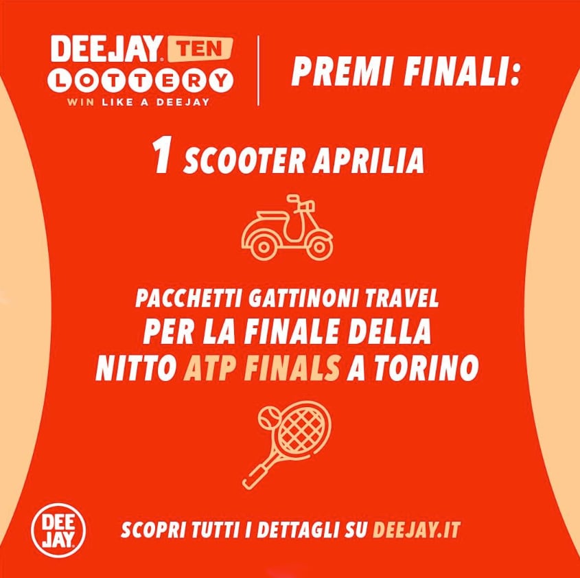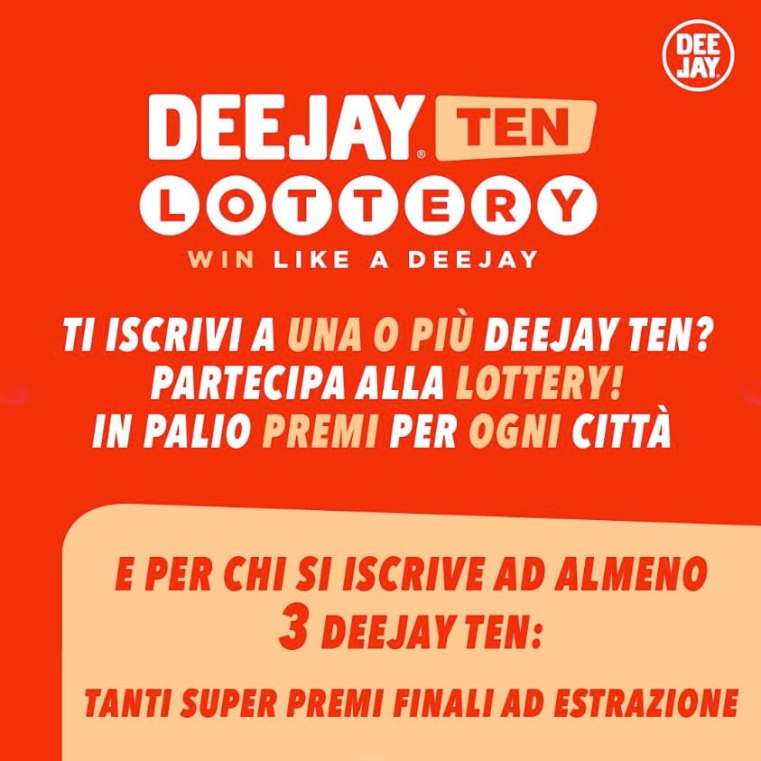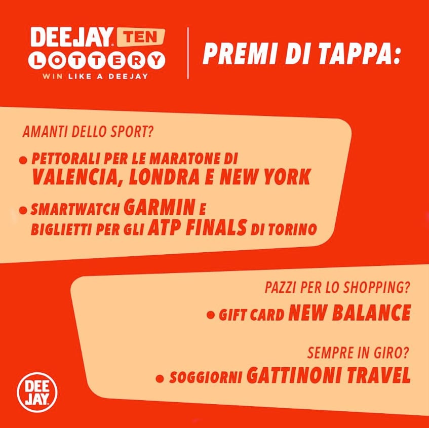 DeeJay TEN Lottery. Le gare sono aperte a tutti ma…attenzione! Creano “dipendenza”: la DeeJay TEN è alla 18ª edizione - dal 2005 è l’evento che ha trasformato il running in intrattenimento - e cresce ogni anno il numero di partecipanti aficionados che corrono tutte le tappe, girando l’Italia. Un bel modo per conoscere le bellezze del Belpaese, grazie a percorsi delineati ad hoc che esaltano il meglio delle città attraversate dalla corsa. Ad ogni tappa si possono vincere tanti premi e, per chi si iscrive in almeno 3 città, ci sarà la possibilità di aggiudicarsi lo scooter Aprilia SR GT (tra i premi finali).