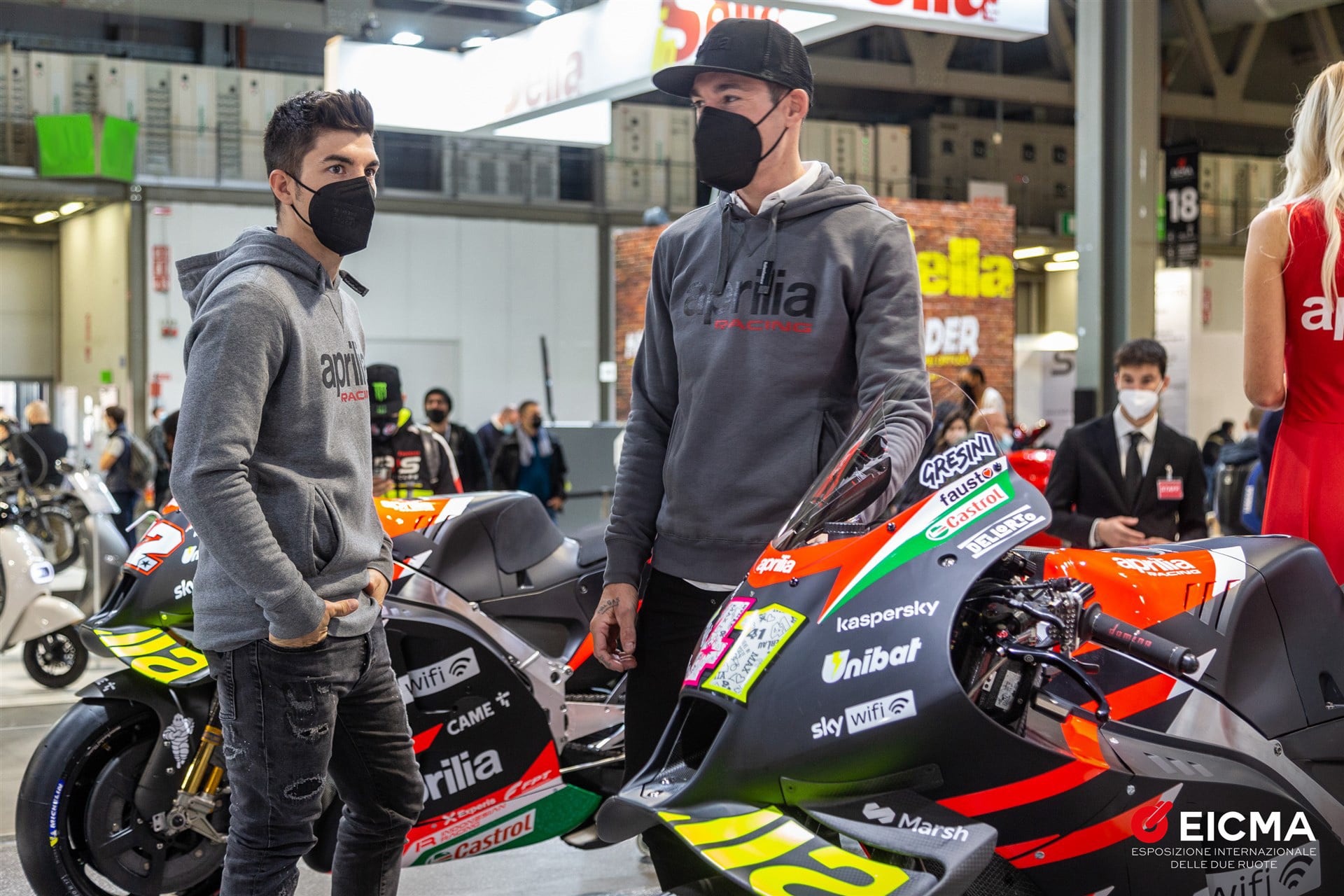 I piloti di Aprilia Racing a Eicma 2021, da sinistra: Lorenzo Savadori, Maverick Viñales e Aleix Espargaro’.