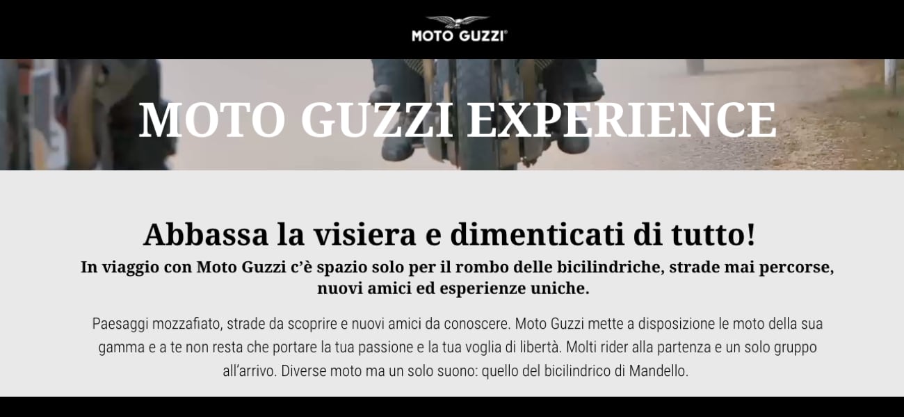 Nata nel 2017, la Moto Guzzi Experience propone avventure in sella alla gamma delle bicilindriche di Mandello, percorrendo strade e luoghi meravigliosi in grado di regalare emozioni autentiche a tutti i motociclisti amanti dell’esperienza on the road, della natura, della scoperta del territorio e dell’amicizia che si crea tra compagni di viaggio.