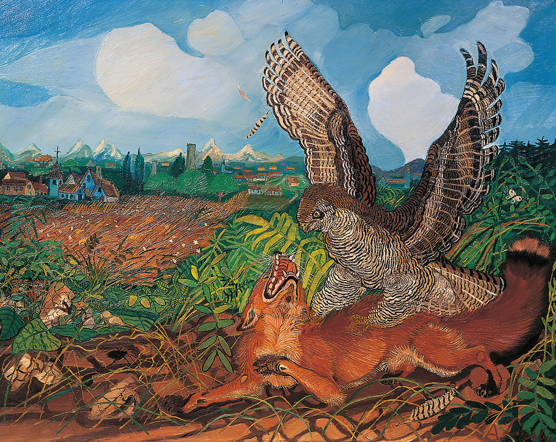 Antonio Ligabue, Volpe con rapace (olio su tela, 1967).