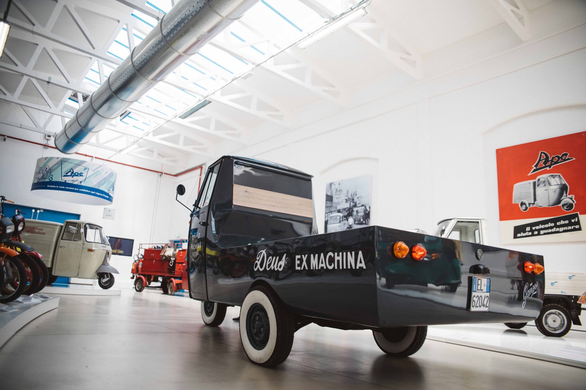 APE THE GANZO BY DEUS EX MACHINA “POSA” PER UNO SCATTO FOTOGRAFICO AL MUSEO PIAGGIO DI PONTEDERA.