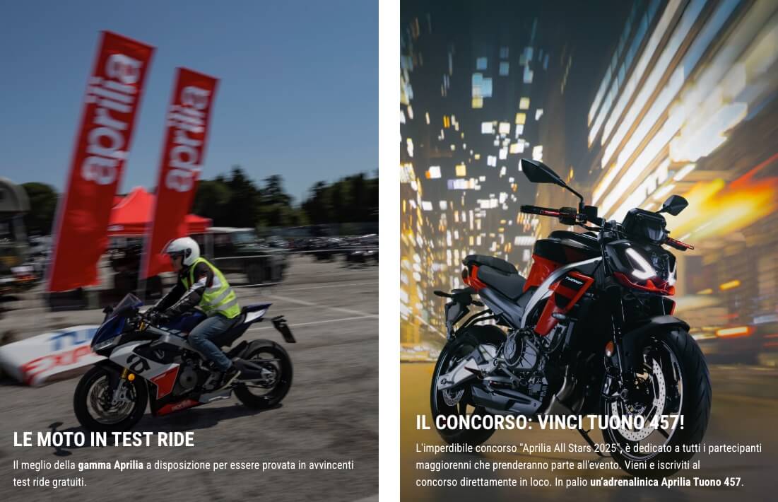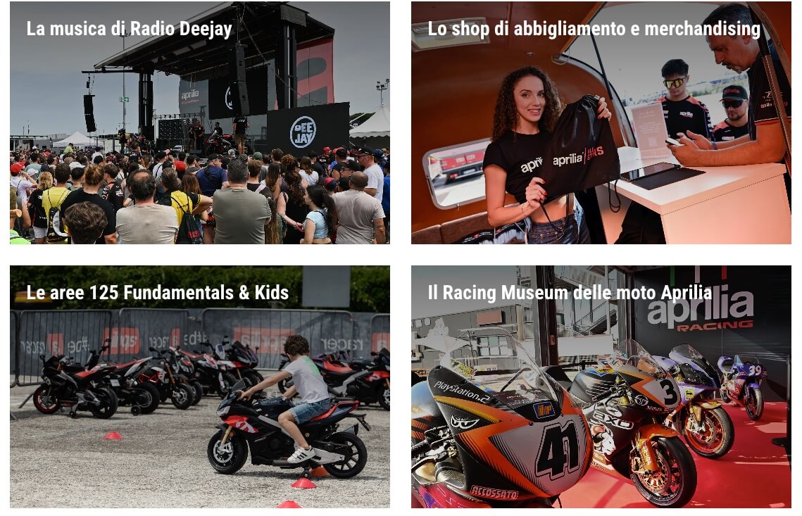 APRILIA CHIAMA A RACCOLTA NON SOLO GLI APPASSIONATI DI MOTOCICLISMO MA ANCHE FAMIGLIE E GRUPPI DI AMICI PER UNA GIORNATA DI FESTA TOTALMENTE GRATUITA, RICCA DI SPETTACOLO IN PISTA E ANIMATA DAL GRANDE PALCO DI RADIO DEEJAY. PROTAGONISTE LE MOTO E I PILOTI MOTOGP APRILIA RACING, MARCO BEZZECCHI, LORENZO SAVADORI E IL CAMPIONE DEL MONDO JORGE MARTIN E CON LORO I PILOTI DEL TEAM TRACKHOUSE, RAUL FERNANDEZ E AI OGURA. IN PISTA GRANDE SPETTACOLO CON LA RACE OF STARS, E POI LE MOTOGP E LE STRAORDINARIE APRILIA 2T CHE HANNO FATTO LA STORIA E I LORO CAMPIONI. SU APRILIA.COM LE MODALITÀ PER VIVERE EXPERIENCE DAVVERO ESCLUSIVE: GIRARE IN PISTA SULLA MOTO BIPOSTO CON UN PILOTA APRILIA RACING; RACING TOUR NEL BOX MOTOGP COI TECNICI APRILIA RACING; ESCLUSIVO PRANZO IN TERRAZZA APRILIA CON PILOTI E VIP; UN POSTO IN PRIMA FILA NELLA SPETTACOLARE PARATA FINALE
