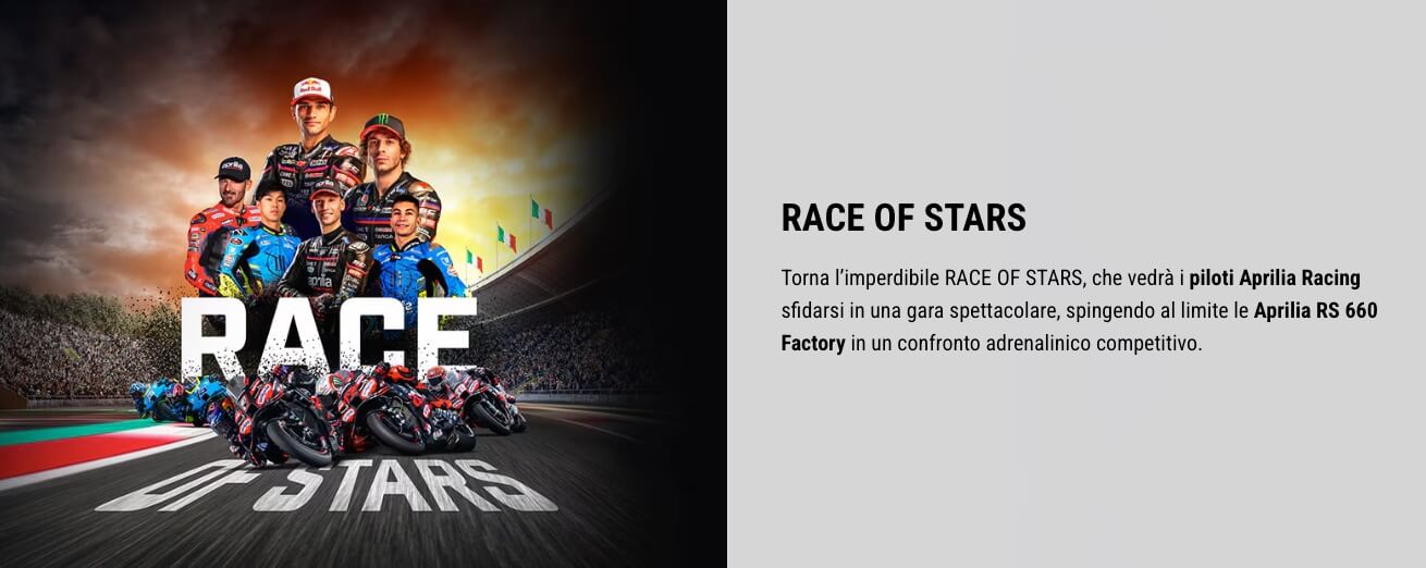 Non mancherà l’adrenalinica Race of Stars, che vedrà i piloti Aprilia Racing sfidarsi in una gara spettacolare, spingendo al limite le Aprilia RS 660 Factory in un confronto che unirà agonismo e grande divertimento.