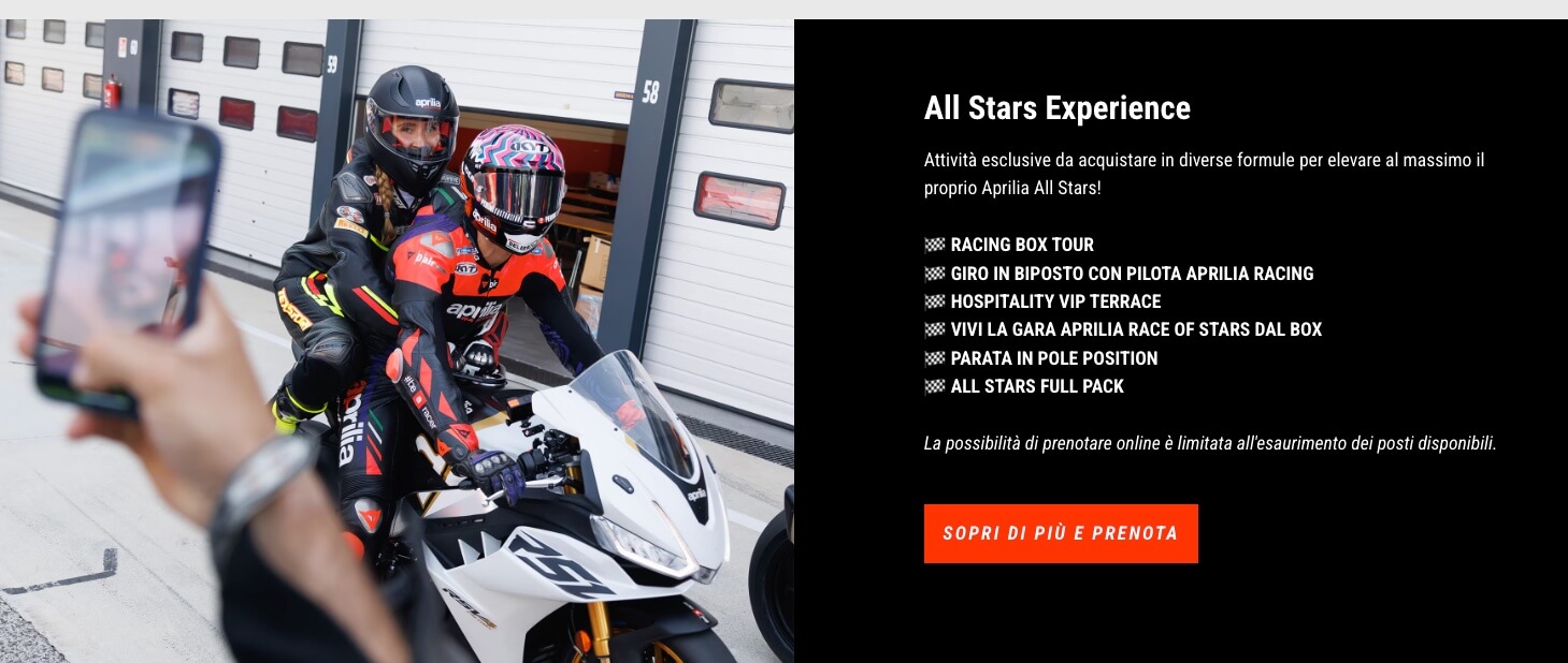 E per vivere esperienze veramente uniche ed esclusive, l’appuntamento è sulla pagina web APRILIA.COM, dove è già possibile acquistare esperienze mozzafiato quali:
