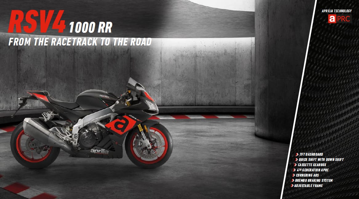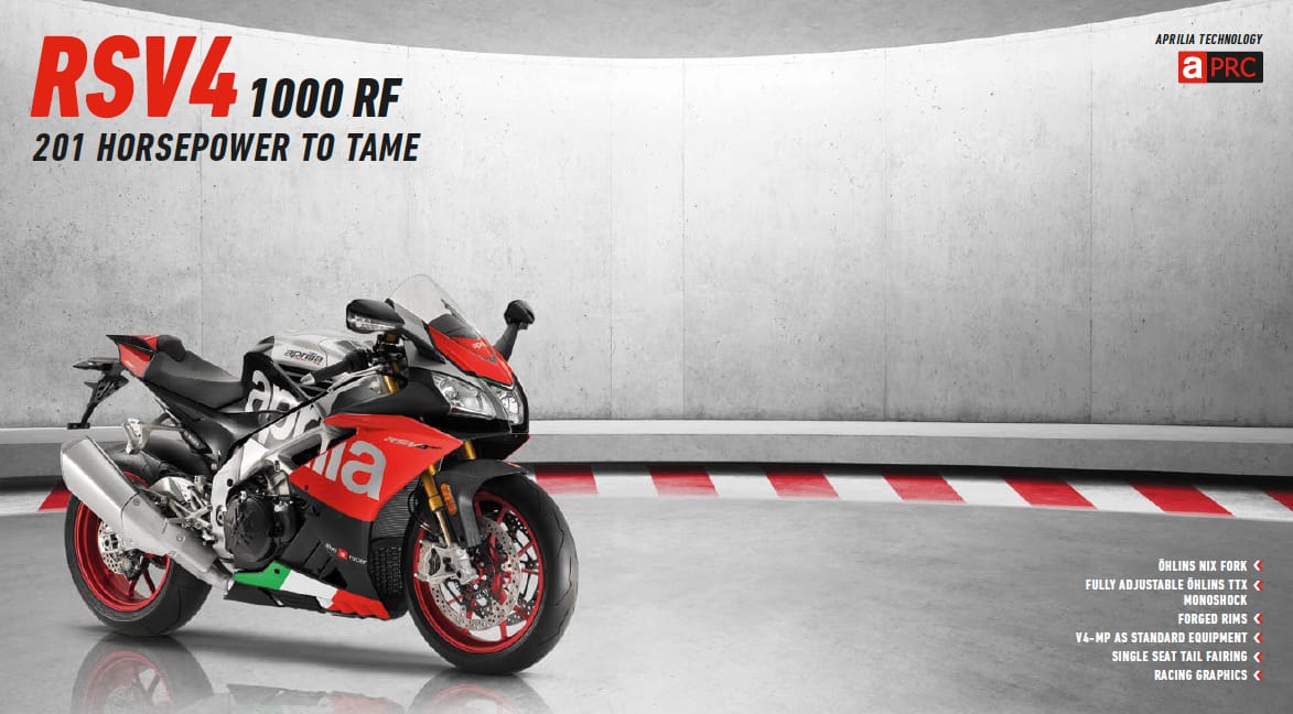 Aprilia RSV4 è la naturale evoluzione di un progetto innovativo, capace di dominare il Mondiale SBK, conquistando sette titoli iridati e di vincere al debutto nel Superstock FIM Cup. Acclamata unanimemente dalla critica, RSV4 è l’indiscussa rappresentante del segmento, il punto di riferimento per sportività e prestazioni, il migliore esempio di quanto sia possibile realizzare attingendo dalla preziosa esperienza di un Reparto Corse vincente come quello di Aprilia, che nella sua giovane storia ha conquistato 54 titoli iridati. Aprilia RSV4 è ideata attorno allo straordinario ed esclusivo 4 cilindri a V stretta, capace di superare la soglia dei 200 CV, ora ulteriormente evoluto e omologato Euro 4, e a un telaio in alluminio ultraregolabile, erede di una dinastia che ha vinto 18 titoli e 143 gran premi nella 250 GP, esaltati dai più moderni sistemi elettronici applicati alla gestione del motore e della dinamica della moto, comprendenti la piattaforma di controlli dinamici APRC, cornering ABS, il Pit Limiter e il Cruise Control. La versione RF di RSV4 comprende leggeri cerchi in alluminio forgiato e un trittico di sospensioni Ōhlins. Tra i numerosi accessori disponibili è presente anche la nuova versione della V4-MP, la piattaforma multimediale di Aprilia che include il sistema di infotainment e introduce, per la prima volta, un vero sistema di taratura corner by corner dei settaggi elettronici.