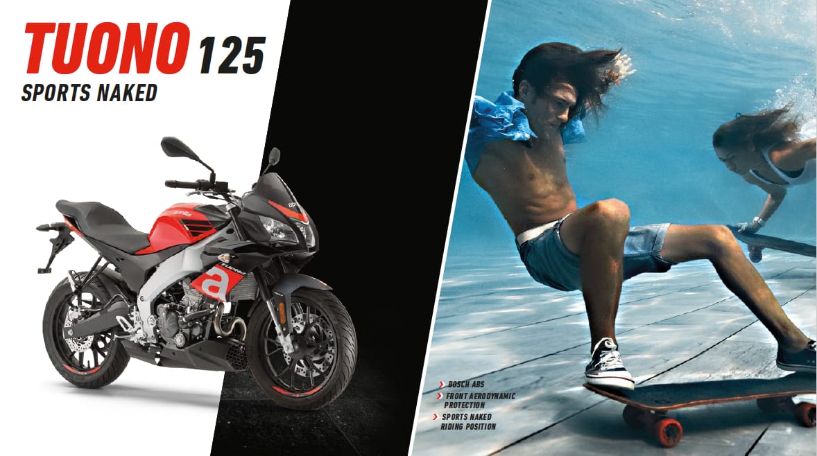 Aprilia Tuono 125 è la vera streetfighter della classe 125, ispirata senza equivoci alla Tuono V4 1100, la supernaked dei record e punta di diamante della produzione di Noale. Disegnata, sviluppata e costruita in Italia, è l’unica 125 ad essere equipaggiata con un telaio realizzato interamente in alluminio, un’opera d’arte ispirata dalla velocità e dal controllo totale della prestazione. Pur vantando contenuti da supersportiva, Aprilia Tuono 125 è stata sviluppata privilegiando il comfort di pilota e passeggero: posizione di guida non estrema, manubrio posizionato per garantire comodità e, al tempo stesso, massimo controllo e completa padronanza del veicolo, pedane pilota studiate per non affaticare, inserti in gomma su pedane pilota e passeggero per migliore isolamento dalle vibrazioni. Aprilia Tuono 125 è spinta da un potente monocilindrico a quattro tempi con distribuzione a quattro valvole; è l’unica naked della categoria ad avere la semicarena solidale al serbatoio, per un maggiore comfort e superiore comodità del pilota. Di serie il sistema di frenata ABS Bosch e la strumentazione con contagiri analogico e display digitale multifunzione, che offre anche orologio e cronometro con memoria di 20 giri. In optional la centralina AMP che abilita la connettività tra moto e smartphone, consentendo di visualizzare sul suo schermo una mole impressionante di dati.