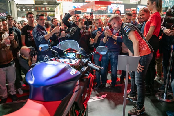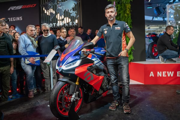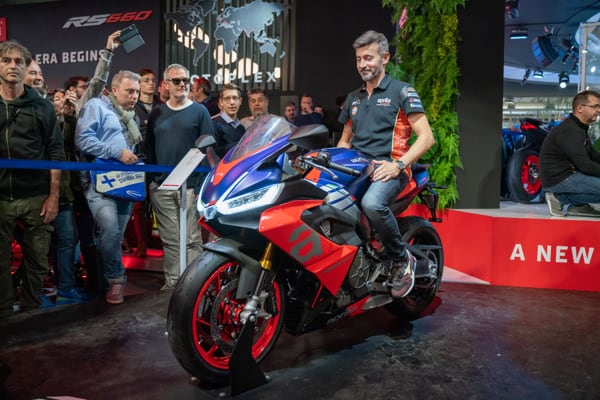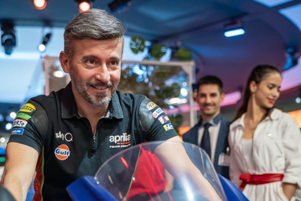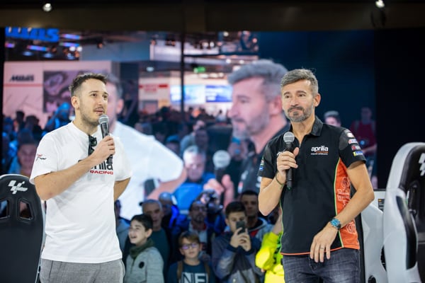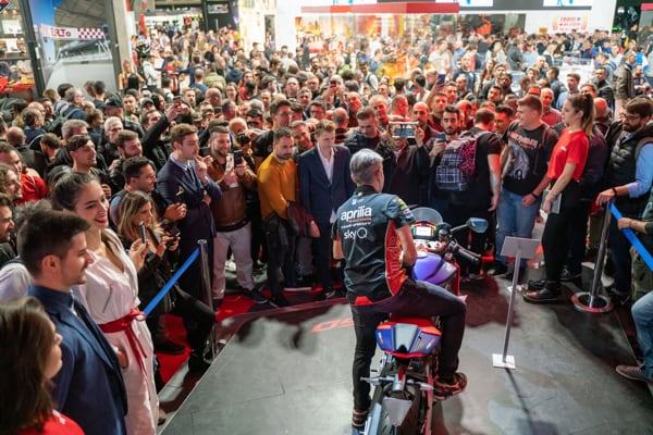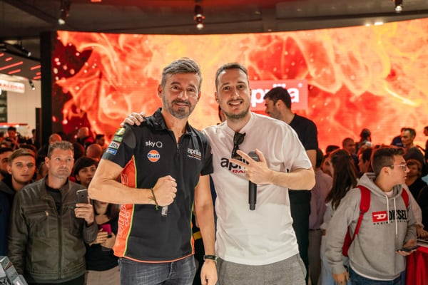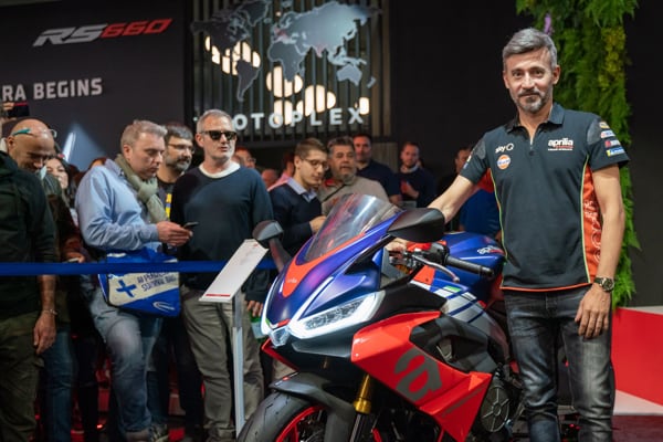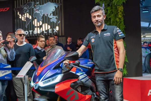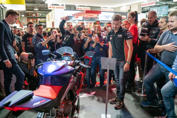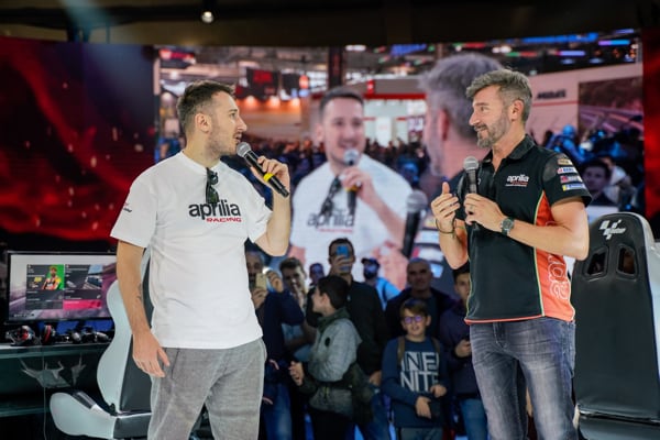 MAX BIAGGI, SEI VOLTE CAMPIONE DEL MONDO, NELLO STAND DEL GRUPPO PIAGGIO A EICMA CON LA NUOVA APRILIA RS 660.
