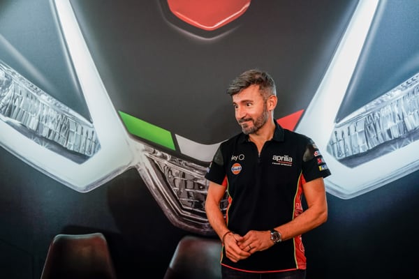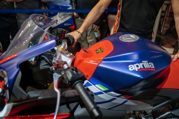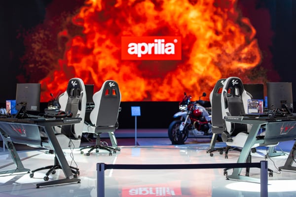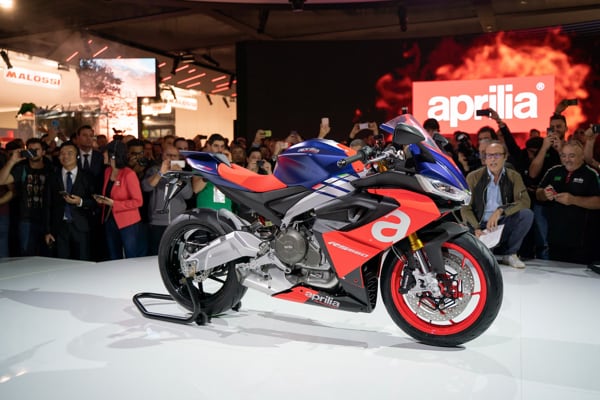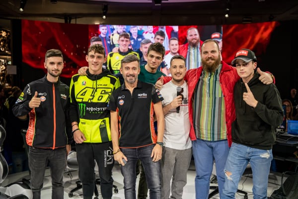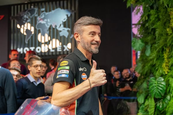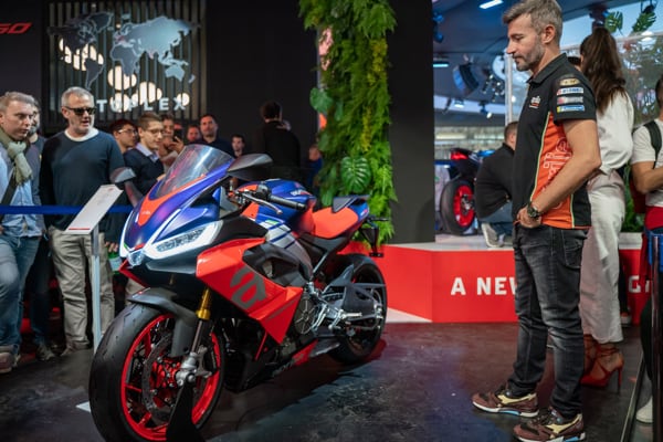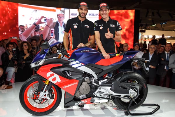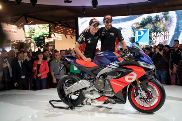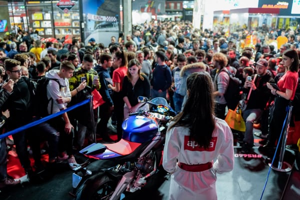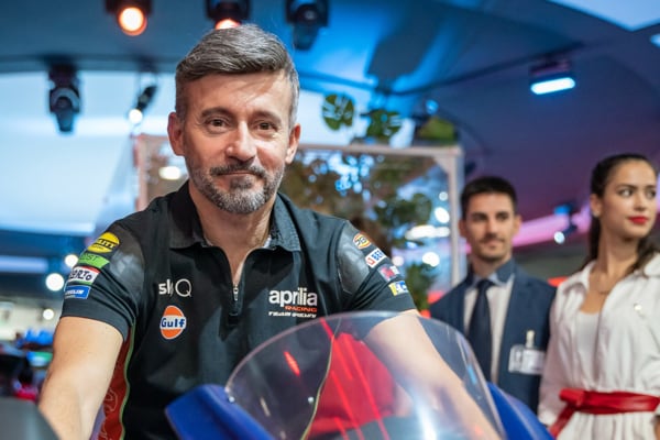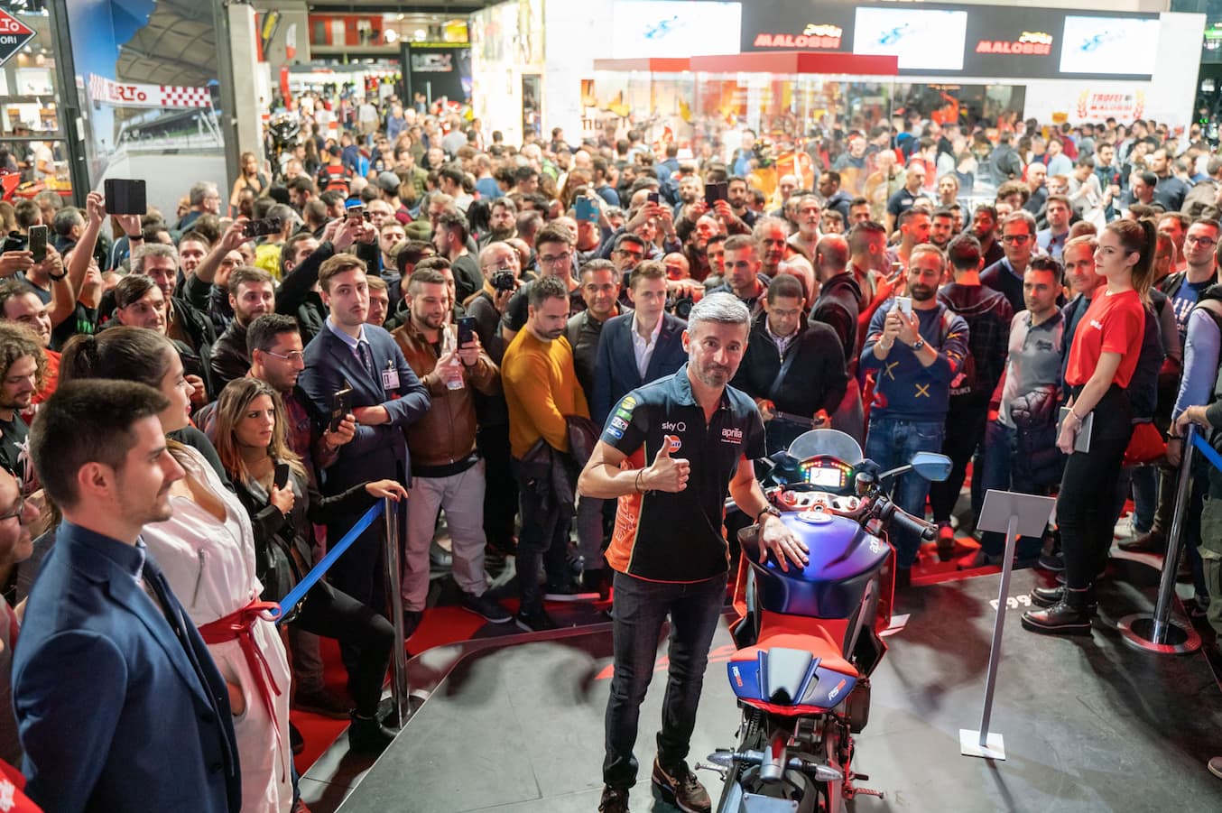 MAX BIAGGI, SEI VOLTE CAMPIONE DEL MONDO, NELLO STAND DEL GRUPPO PIAGGIO A EICMA CON LA NUOVA APRILIA RS 660.