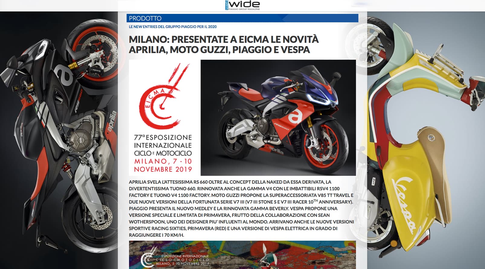 GRUPPO PIAGGIO PROTAGONISTA. A Eicma 2019 il Gruppo Piaggio è stato gran protagonista: ha presentato eccezionali novità moto e scooter dei suoi esclusivi brand e un ricco programma di eventi coinvolgenti, molto seguiti da stampa e pubblico, all’interno del superbo maxi stand di 1.800 mq, dove sono state svelate le attesissime proposte dei blasonati marchi Aprilia, Moto Guzzi, Vespa e Piaggio. Come l’attesa RS 660 e il concept della naked Tuono 660, le rinnovate RSV4 1100 Factory e Tuono V4 1100 Factory, l’accessoriata Moto Guzzi V85 TT Travel, le nuove versioni V7 III (Stone e Racer 10th Anniversary), il nuovo Piaggio Medley e la rinnovata gamma Beverly, Vespa Primavera by Sean Whoterspoon, le nuove versioni sportive Vespa Racing Sixties, Primavera (RED) e Vespa Elettrica 70 KM/H.