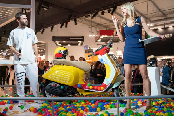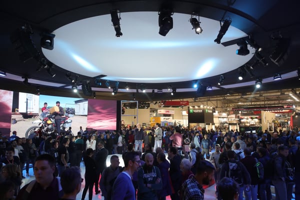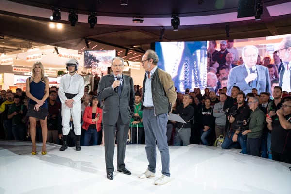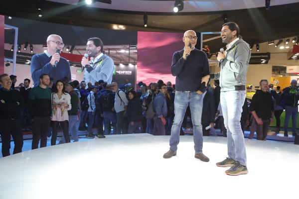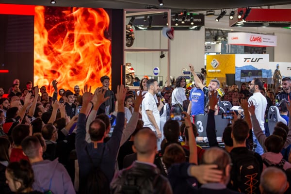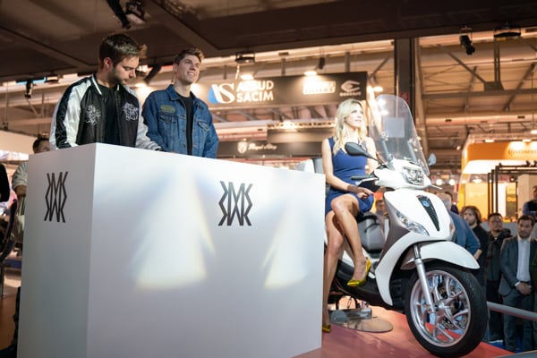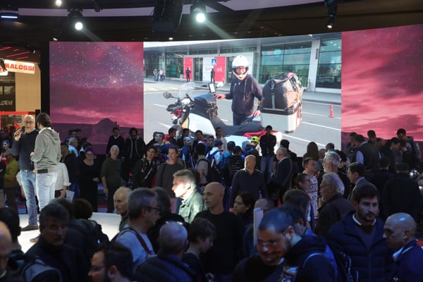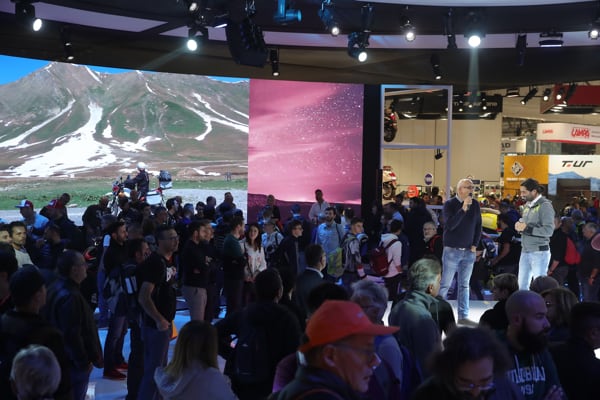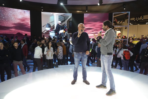 LA CONFERENZA STAMPA (5 novembre 2019). È stata un vero e proprio show sul “palcoscenico” centrale dell’area espositiva del Gruppo Piaggio, con mega schermi ad “avvolgere” i numerosissimi giornalisti e operatori media provenienti da tutto il mondo, rimandando immagini adrenaliniche. I giornalisti e telecronisti sportivi Guido Meda e Vera Spadini hanno condotto l’evento, aperto dal Presidente e AD del Gruppo Piaggio Roberto Colaninno, in un susseguirsi di sorprese, brand per brand, valorizzate dalla musica del celebre duo di dj Mark & Kremont.