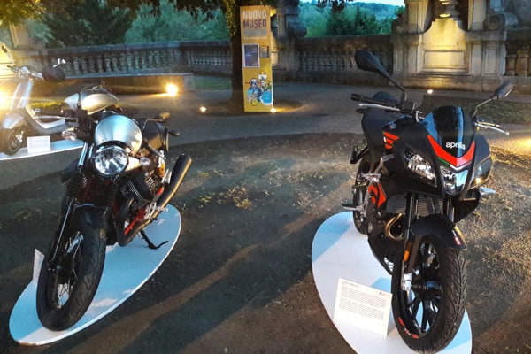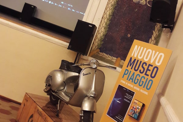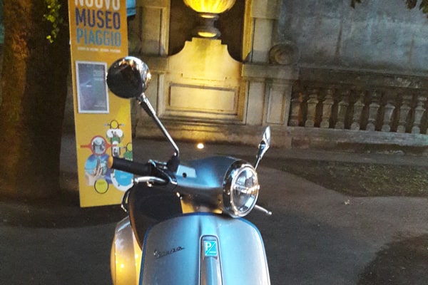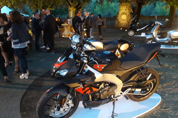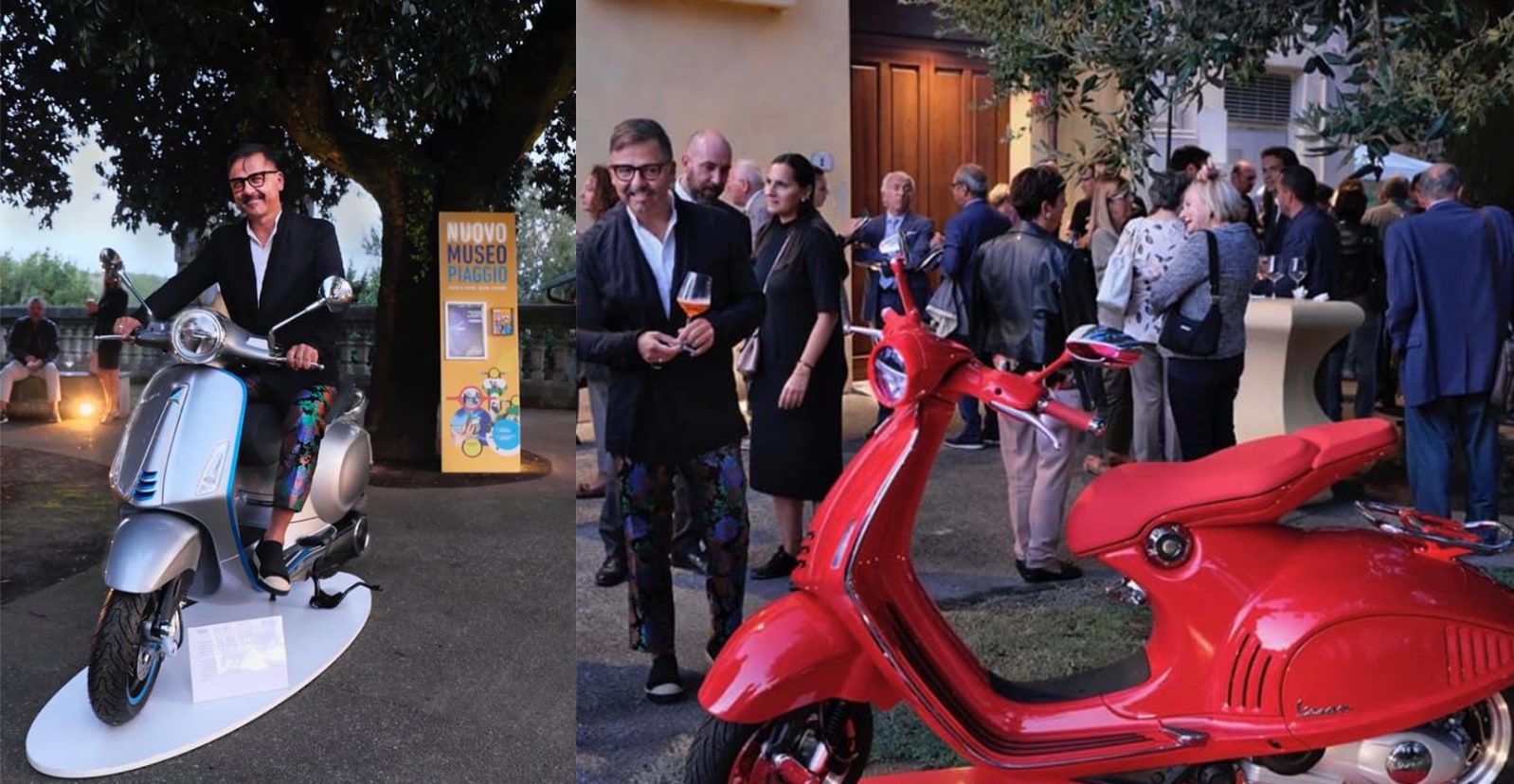 Invitati accolti da un aperitivo nel giardino antistante il Teatro di Vinci, con esposizione di veicoli del Gruppo Piaggio, quali Vespa 946, Vespa Elettrica, Piaggio MP3, Moto Guzzi V7 III Racer, Aprilia Tuono 125 e una superba Vespa vintage, modello GS, posizionata all’interno del Teatro.