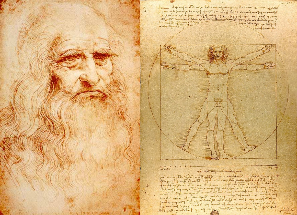 Opere di Leonardo da Vinci: Autoritratto, 1510-1515 (Torino, Biblioteca Reale); Uomo Vitruviano, studio sulle proporzioni “ideali” del corpo umano (Venezia, Accademia).