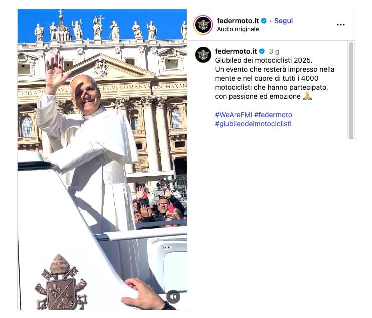 Rocco Lopardo, Vicepresidente FMI e Coordinatore Commissione Turismo e Tempo Libero FMI: “Una giornata indimenticabile. Vedere una piazza gremita di motociclisti appassionati, accorsi da ogni parte d’Italia, è per la Federazione motivo di grande orgoglio. Un evento di questa portata è il simbolo di un movimento importante, è la conferma di quello che è lo spirito di noi motociclisti. Condivisione, senso di appartenenza, amicizia e solidarietà. Il bellissimo progetto “Caschi per il cuore”, l’incontro con il Santo Padre, a cui è stato donato un Casco frutto della creatività di bambini in difficoltà, sono stati momenti di profonda emozione. Sono davvero grato per aver vissuto tutto questo e per aver rappresentato la nostra comunità”.