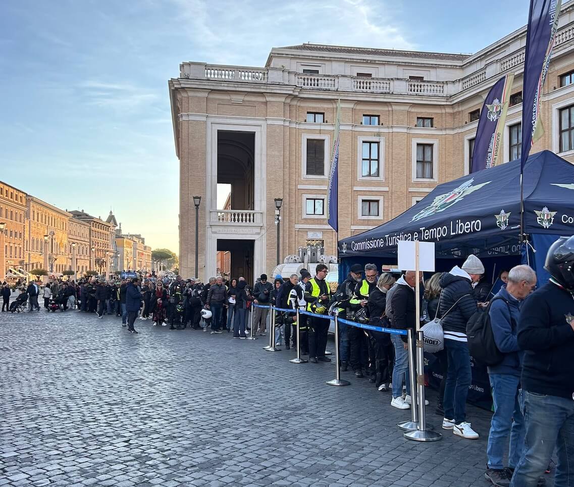 Dalle prime ore del mattino, immersi nella suggestiva luce dell’alba che sorgeva su Piazza San Pietro, i motociclisti hanno iniziato a radunarsi con entusiasmo recandosi presso il punto accoglienza FMI. Qui hanno ritirato il welcome kit, contenente bandierine, foulard, spille e altri simboli ufficiali della Federazione, pensati per celebrare l’unicità dell’evento e offrire ai partecipanti un ricordo tangibile da custodire. Successivamente, si sono diretti verso il settore riservato in Piazza, dove l’atmosfera si è caricata di attesa e trepidazione.