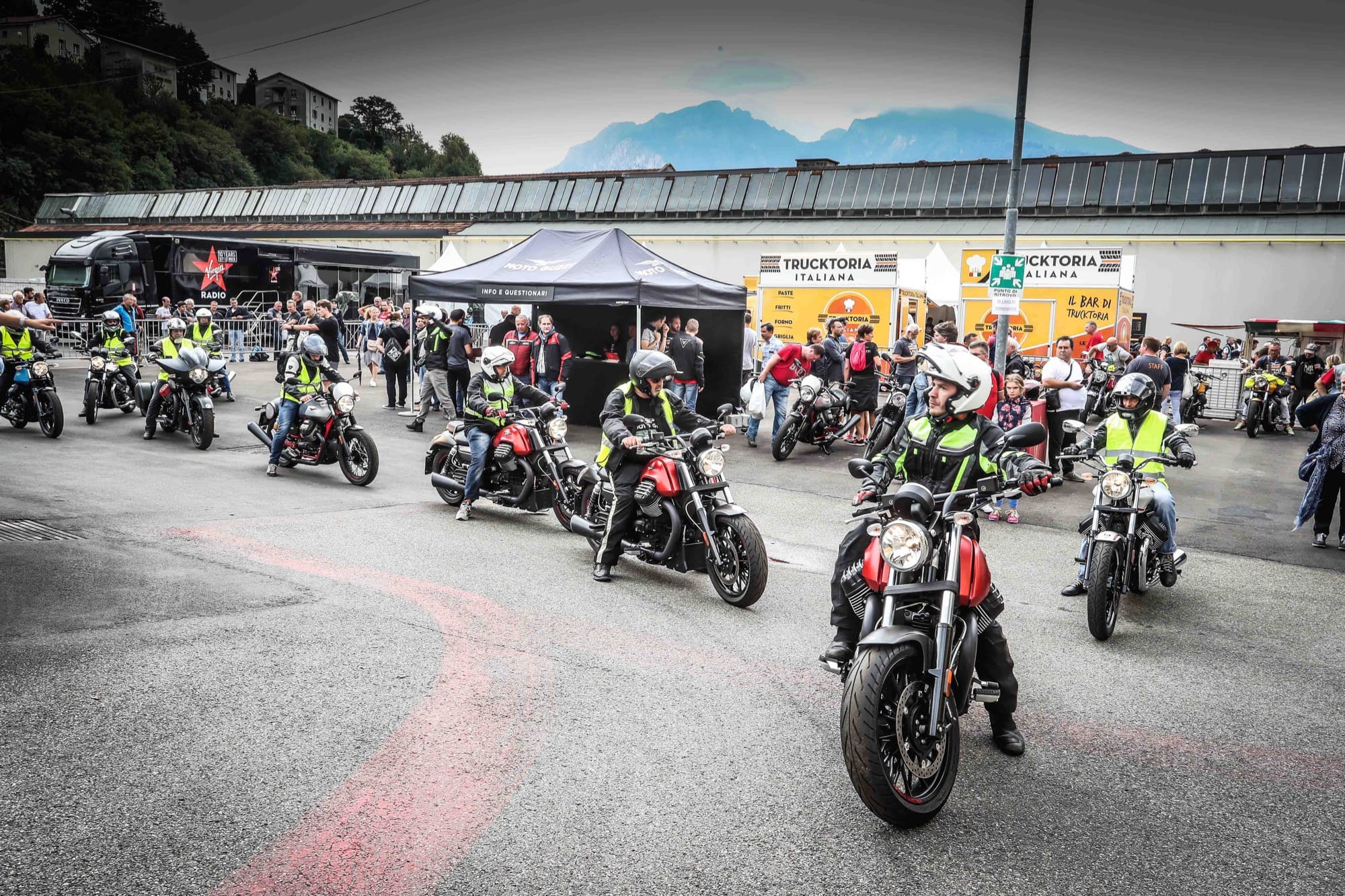 Moto Guzzi Open House 17 - The "Guaro" test rideAl centro del Moto Guzzi Village, nel cuore dello stabilimento, la musica di Virgin Radio si è alternata ai momenti di intrattenimento guidati da Ringo.