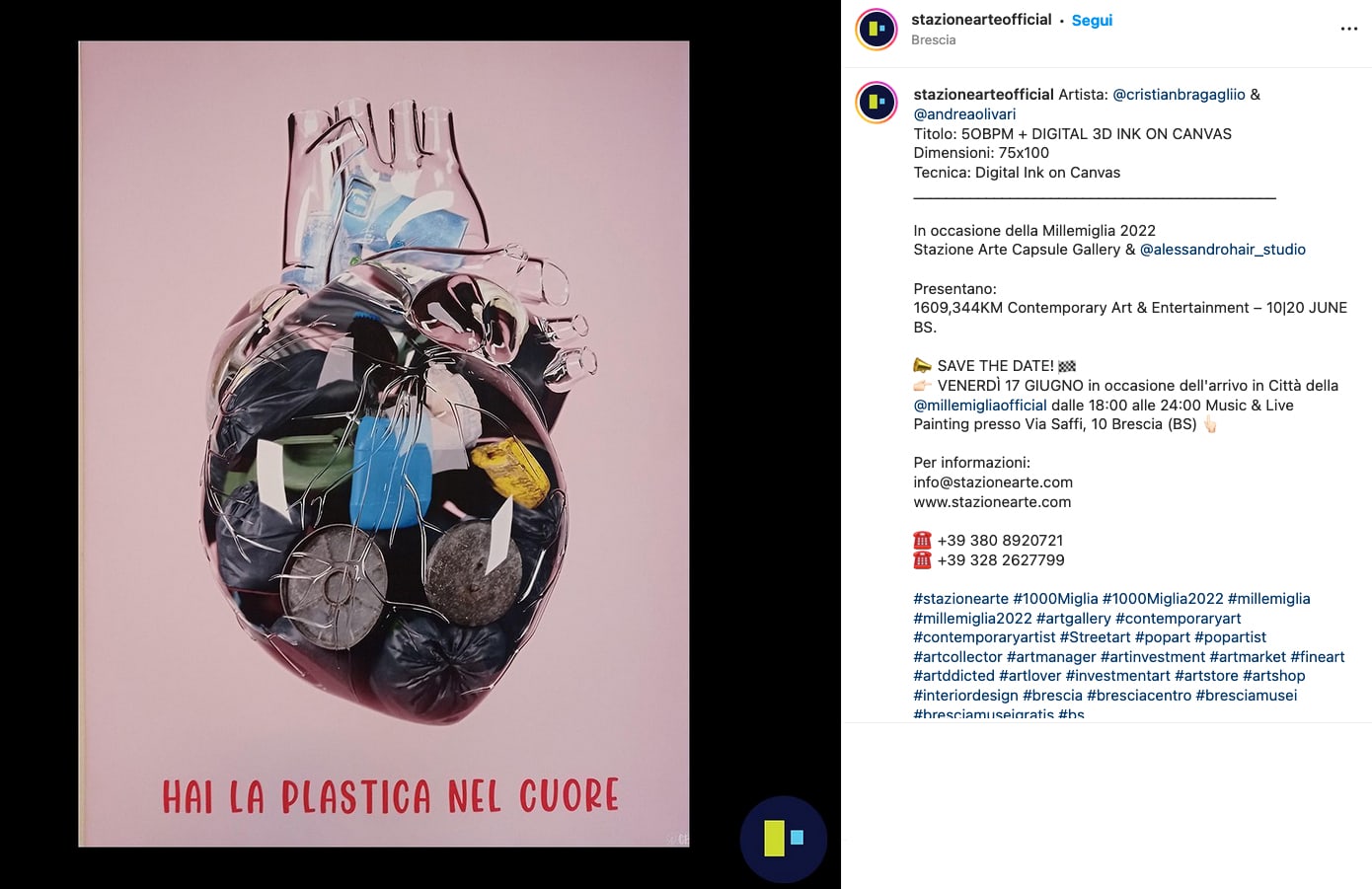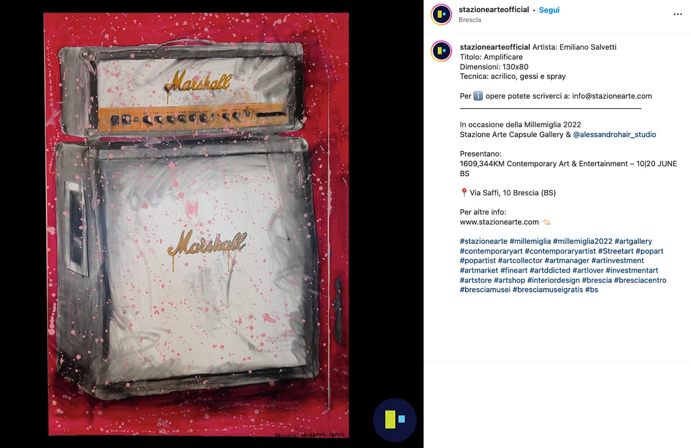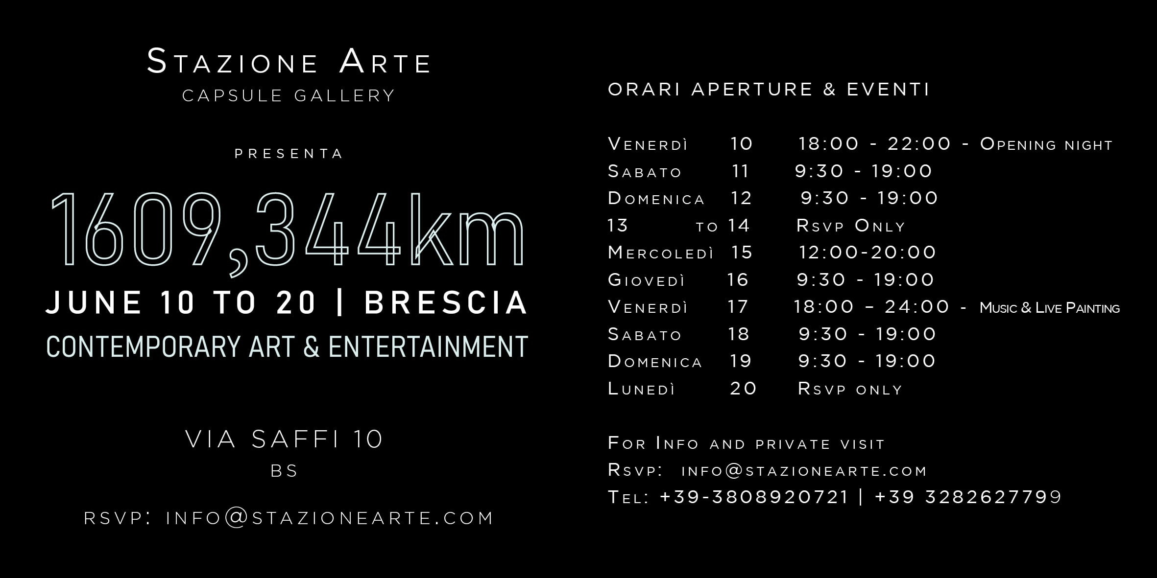 Giugno 2022 - In occasione della Millemiglia 2022 Stazione Arte Capsule Gallery & Alessandro Hair Studio presentano la rassegna “1609,344KM Contemporary Art & Entertainment”: un viaggio nell’ Arte Contemporanea urbana attraverso una selezione di opere di soli artisti italiani, di diverse decadi e regione di appartenenza. Una mostra a tappe, tutta italiana, dal sapore internazionale, come la corsa più affascinante e storica del mondo, che celebra le arti e le bellezze del nostro Paese.