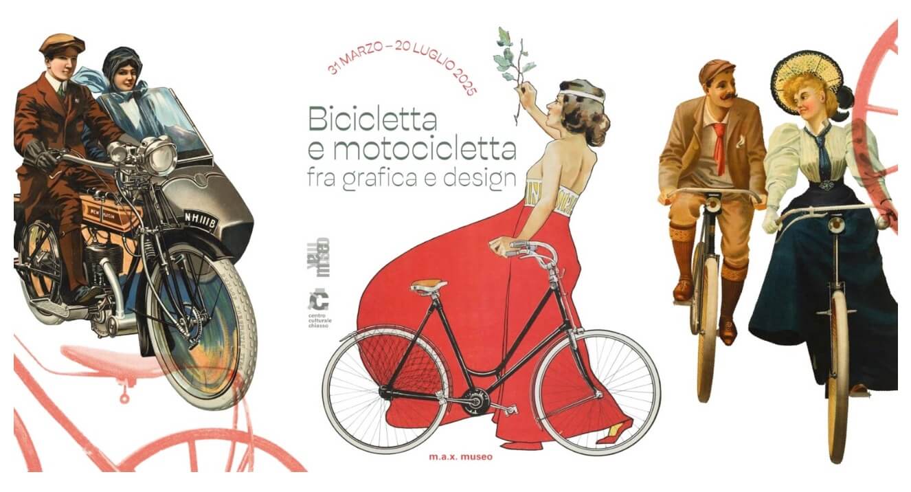 Aprile 2025 (G.T.) – Inaugurata il 30 marzo, la mostra “Bicicletta e Motocicletta fra grafica e design” – al m.a.x. museo di Chiasso (Svizzera), fino al 20 luglio 2025 – si inserisce nell’ambito dell’approfondimento pluriennale che il m.a.x. museo dedica ciclicamente ai mezzi di trasporto (dopo le mostre Auto che passione, del 2018 e Treni fra arte, grafica e design, nel 2021). Questa volta viene proposta una riflessione organica sulle valenze sociali e culturali dei mezzi di trasporto a due ruote, letti attraverso la storia della grafica e del design. Nella seconda metà dell’Ottocento e nei primi del Novecento la rivoluzione industriale ha portato con sé tutta una serie di scoperte e cambiamenti, che ancora oggi condizionano il nostro modo di vivere, all’insegna del movimento e della velocità. In questo contesto, un ruolo importante l’hanno svolto anche la bicicletta e la motocicletta.