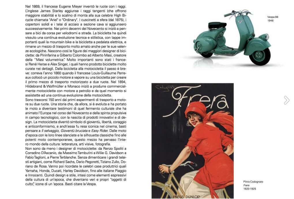 Il percorso espositivo propone, nelle quattro sale del museo, materiali di grande interesse: dai meravigliosi manifesti cromolitografici firmati dai maestri della grafica quali Leopoldo Metlicovitz, Marcello Dudovich, Plinio Codognato, Achille Luciano Mauzan, Gino Boccasile, Erberto Carboni e Armando Testa; a locandine, grafiche pubblicitarie, bozzetti, cartoline, brochure e vari oggetti di design legati alla bicicletta e alla motocicletta. Appunto il design è l’altro elemento distintivo della mostra, e infatti affiancano le produzioni grafiche iconici esemplari originali di biciclette e motociclette: una ventina in totale, dai primordi ai modelli “del futuro”, rappresentativi dei marchi che più hanno segnato l’evoluzione delle due ruote, compresi anche rari esemplari prodotti in Svizzera.