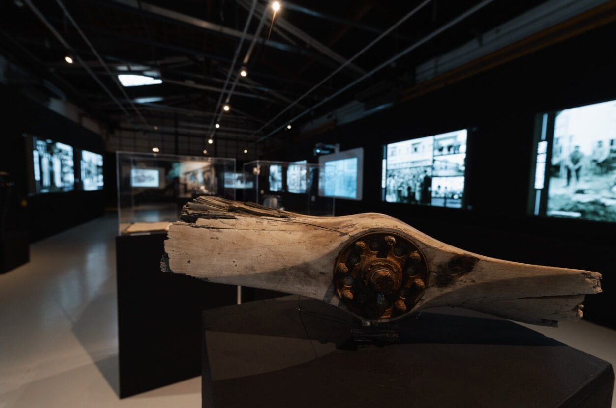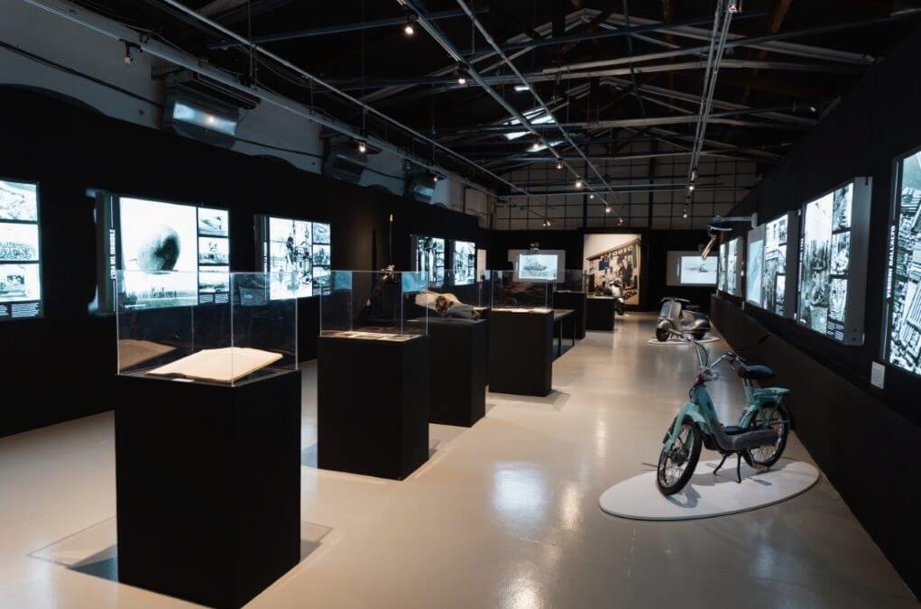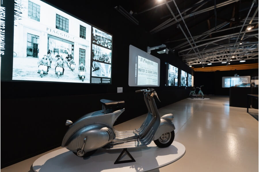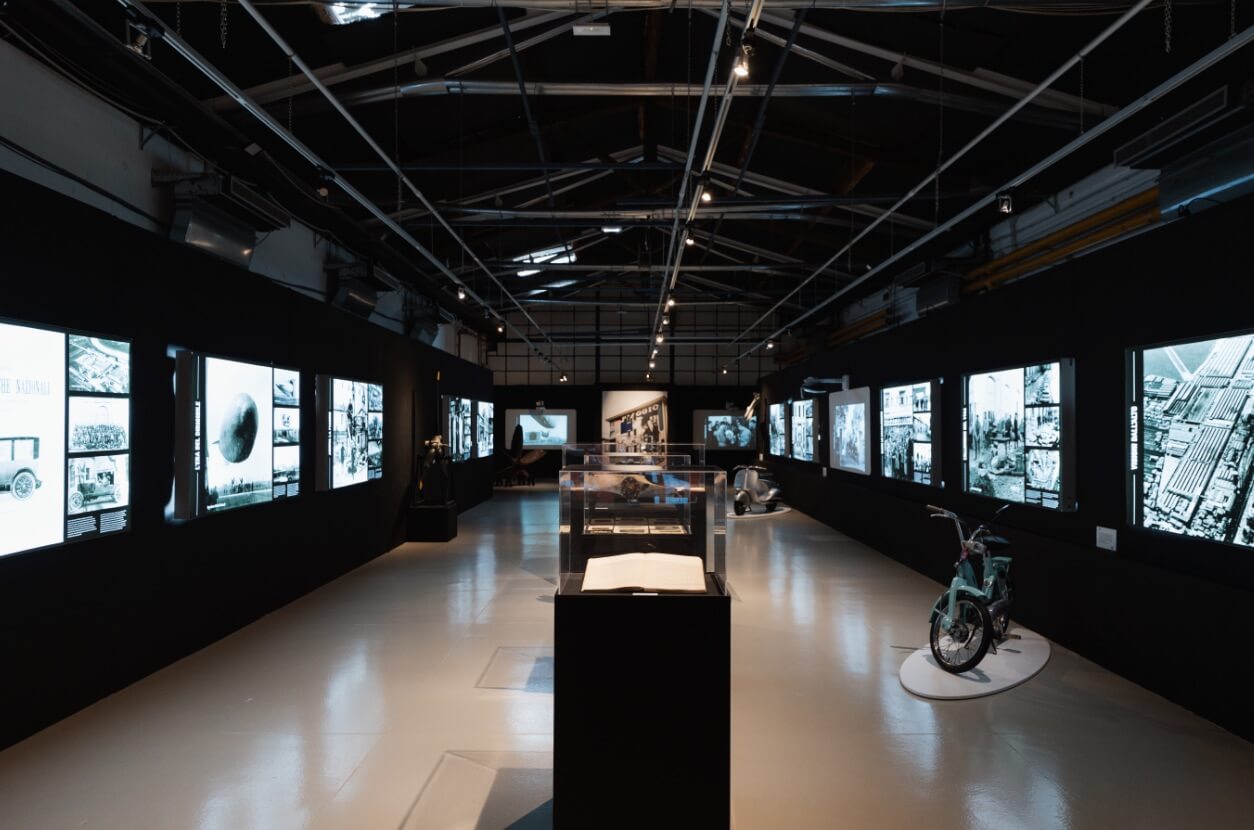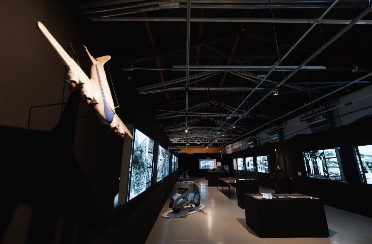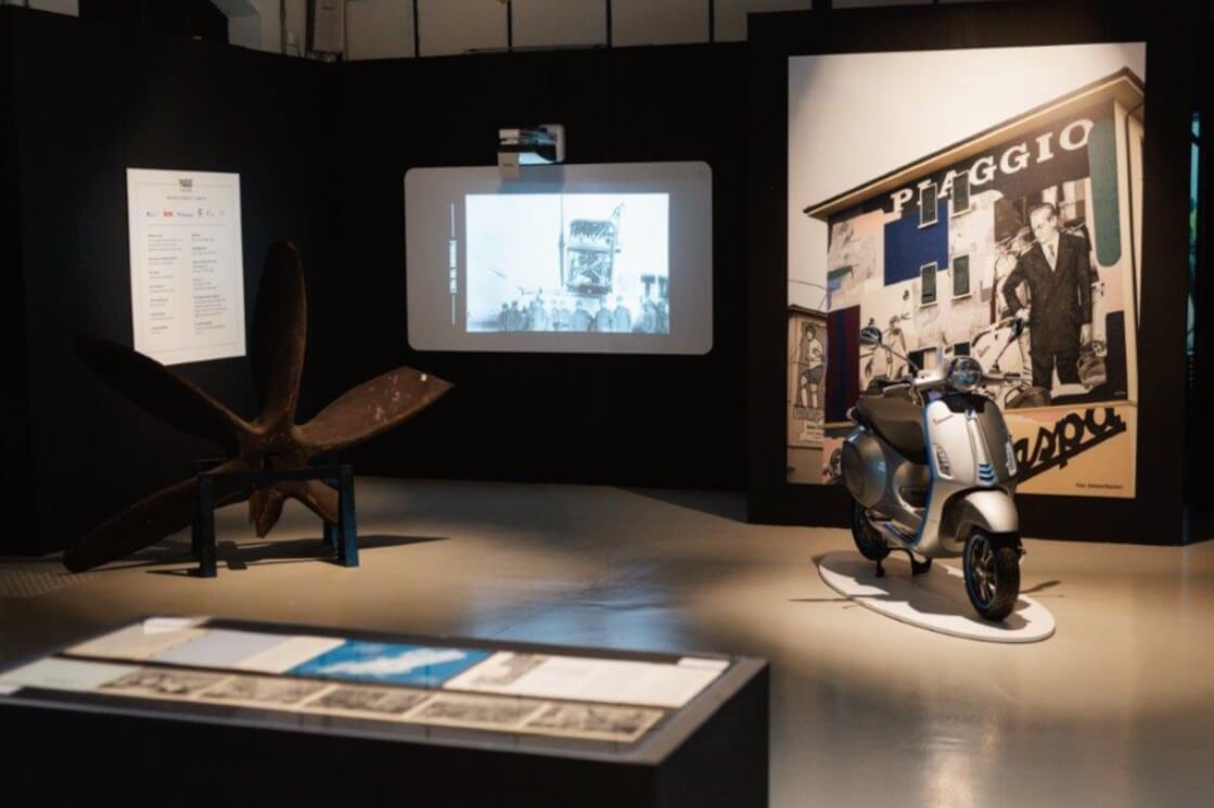 Il percorso espositivo – in 10 sezioni – si snoda attraverso collage fotografici d’impatto, composti da molte foto inedite, presentati al pubblico in un allestimento suggestivo tramite pannelli retroilluminati, ed è impreziosito da documenti dell’Archivio Storio Piaggio per la prima volta esposti in originale (verbali, contratti, planimetrie e progetti, corrispondenza, materiali di comunicazione), veicoli e oggetti della Collezione del Museo Piaggio e di collezionisti, proiezioni.