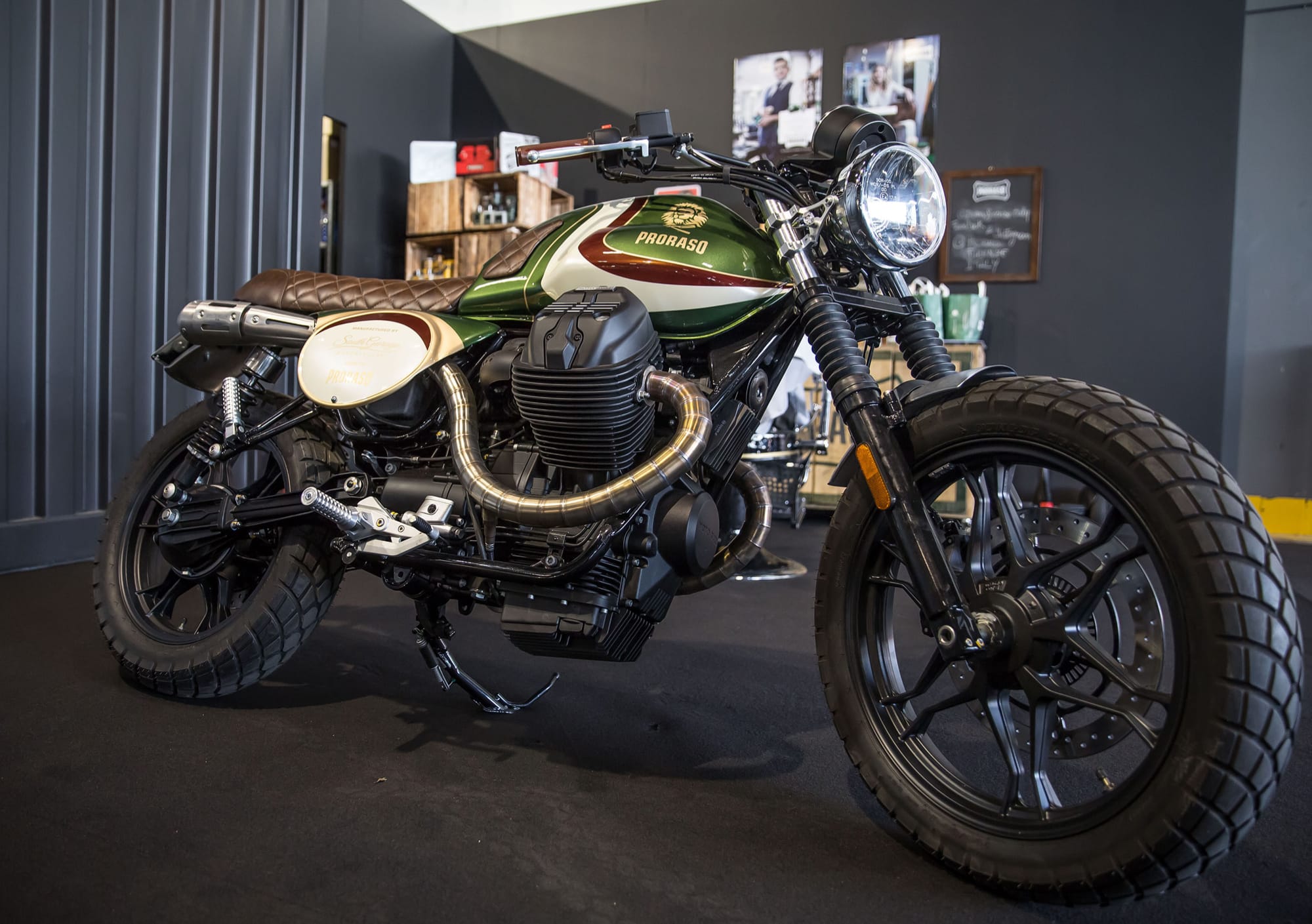 Presso lo spazio Moto Guzzi sono esposte alcune eccezionali special, interpretate e radicalmente modificate da alcuni tra i più famosi preparatori. È il caso della V7 realizzata da South Garage per il brand Proraso, straordinaria anticamera al “Barber Shop” dedicato.
