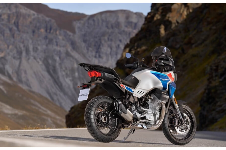 Stelvio è spinta dal nuovo motore “compact block”, appena introdotto su V100 Mandello, ulteriormente affinato, un motore assolutamente all’avanguardia per progettazione e costruzione; è compatto e leggero, permettendo di avere una ciclistica agile e dal piglio sportivo. Si tratta di un bicilindrico a V trasversale di 90° con raffreddamento a liquido e distribuzione a doppio albero a camme in testa con bilancieri a dito e 4 valvole per cilindro. Il cambio a sei marce è stato rivisto per renderlo ancora più fluido e morbido negli innesti. Le prestazioni di cui è capace questo propulsore sono di natura chiaramente sportiva: la potenza massima è di 115 CV a 8.700 giri/min mentre la coppia massima di 105 Nm a 6.750 giri/min, con l’82% disponibile già da 3.500 giri/min e il limitatore fissato a ben 9.500 giri/min.