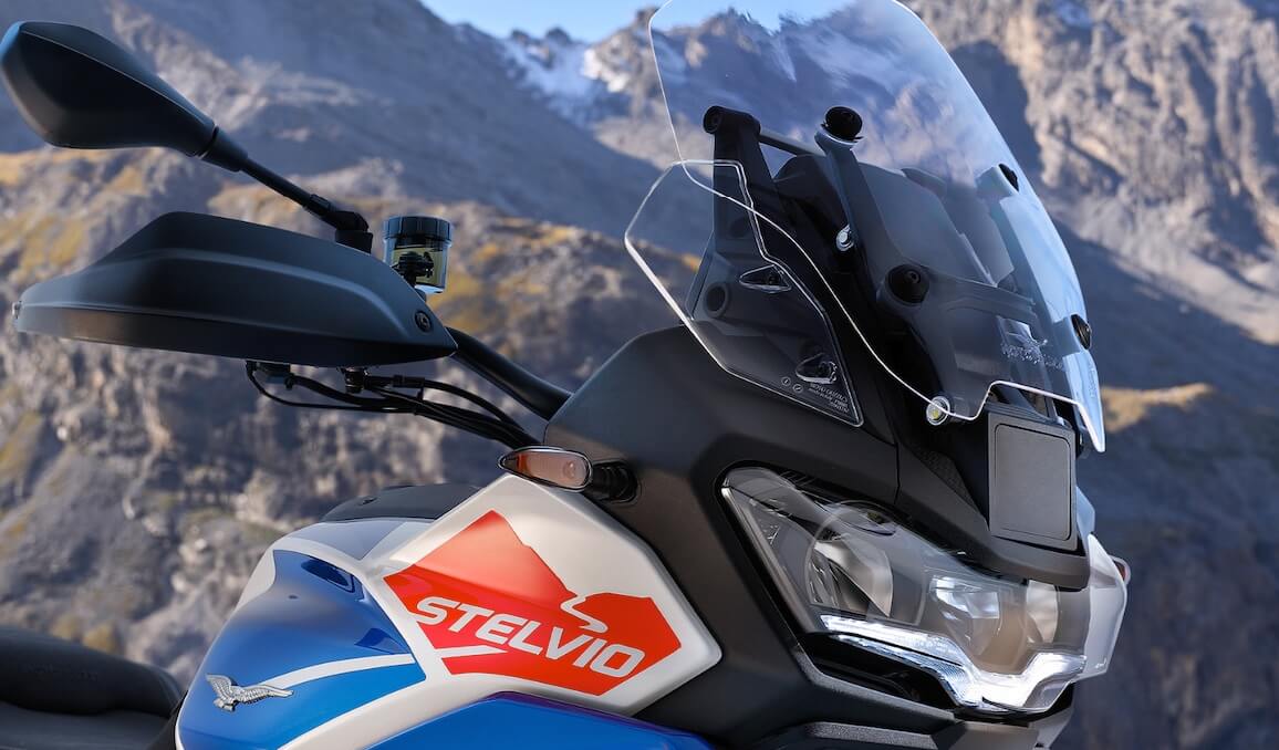 Moto Guzzi Stelvio. Stelvio è la on-off di Moto Guzzi pensata per il viaggio avventuroso. Nasce su una piattaforma tecnica nuova e assolutamente moderna ed è l’unica della sua classe di cilindrata con la trasmissione ad albero cardanico e con il parabrezza regolabile in altezza elettricamente. L’aerodinamica ha beneficiato di uno studio molto approfondito per massimizzare la protezione dall’aria, il comfort e il piacere di guida. Il parabrezza è stato oggetto di un particolare studio ed ha una forma in grado di deviare i flussi evitando vortici di aria posteriori, coadiuvato dalla presenza dei due deflettori laterali.