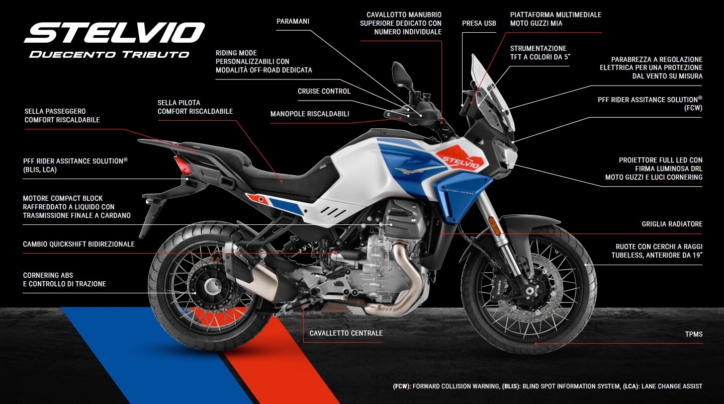 A inaugurare la strada ci sarà ovviamente la moto di casa, la Moto Guzzi Stelvio Duecento Tributo, speciale versione della modernissima adventure dell’Aquila pensata per il viaggio senza confini, e che del celebre Passo porta il prestigioso nome. Realizzata in edizione limitata e numerata di 2.758 esemplari, a evocare la quota del valico, Stelvio Duecento Tributo si distingue per la colorazione dedicata e per il completo equipaggiamento di serie.