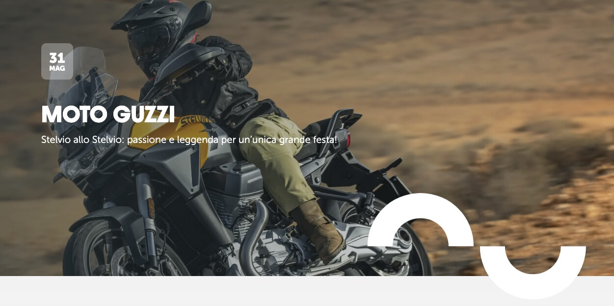QUESTO FINE SETTIMANA MOTO GUZZI INVITA TUTTI I MOTOCICLISTI AL VALICO STRADALE PIÙ ALTO D’EUROPA, PER CELEBRARE L’APERTURA STAGIONALE E IL BICENTENARIO DI UN LUOGO MITICO. APPUNTAMENTO SABATO 31 MAGGIO, A BORMIO, PER PERCORRERE I 40 TORNANTI CHE PORTANO FINO AI 2.758 METRI DI QUOTA, CON UNA APRIPISTA D’ECCEZIONE: LA MOTO GUZZI STELVIO DUECENTO TRIBUTO PER TUTTO IL WEEKEND, ESCLUSIVI TEST RIDE PER PROVARE L’INTERA GAMMA DELL’AQUILA: STELVIO, V85, V100 MANDELLO E LA NUOVISSIMA V7 SPORT