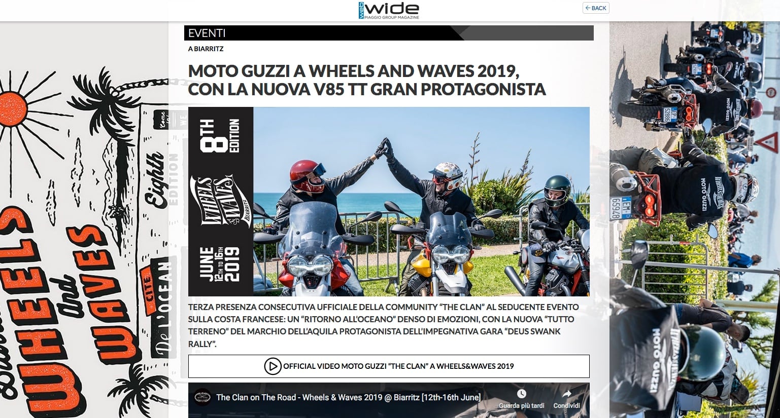 Luglio 2019 – Anche quest’anno, Moto Guzzi e la sua community ufficiale The Clan hanno partecipato a Wheels & Waves, a Biarritz (12-16 giugno 2019), l’emozionante festival motociclistico sulla costa francese, giunto all’8a edizione. Qui il video.