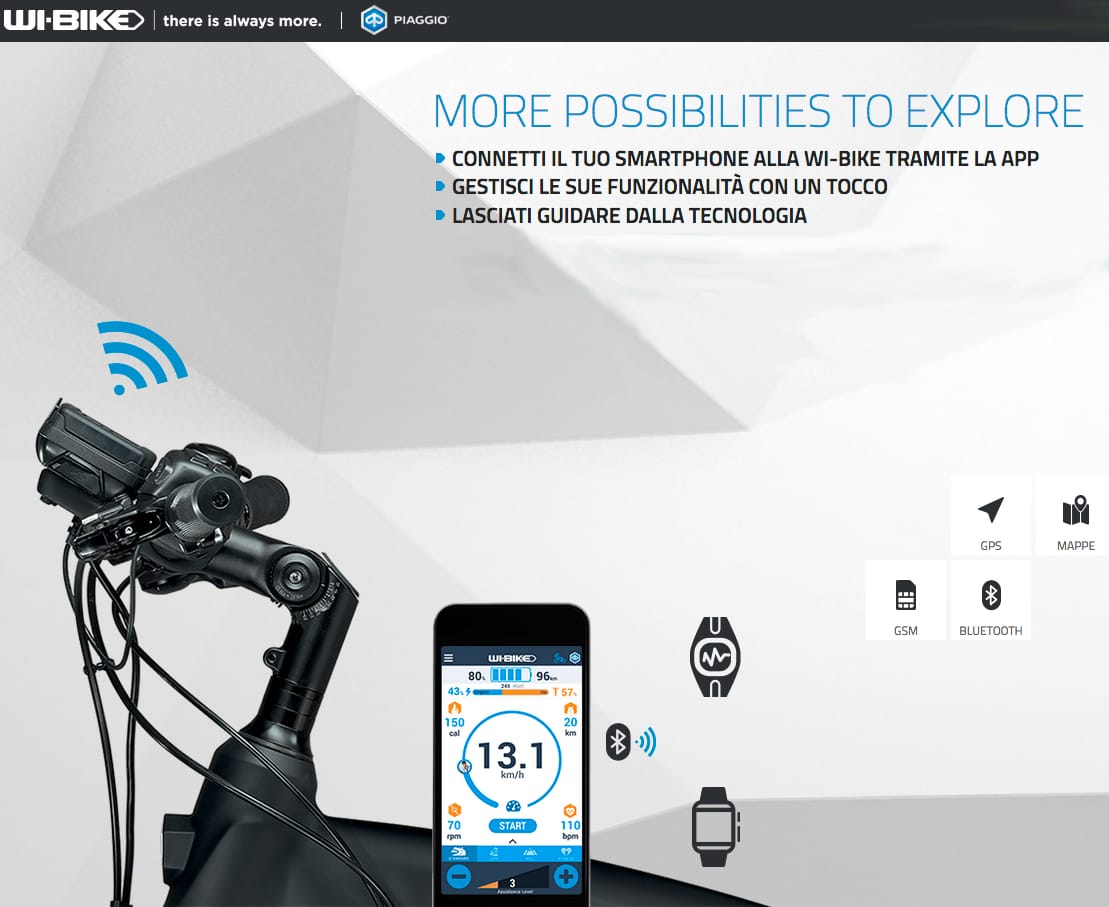 Grazie alla tecnologia PMP (Piaggio Multimedia Platform), lo smartphone si collega via bluetooth a Wi-Bike per monitorare, tramite App, i dati dell’allenamento e fissare obiettivi in termini di ritmo cardiaco o consumo di calorie. Ma Wi-Bike significa anche community: al termine di ogni itinerario, è possibile condividere con i propri amici i dati relativi all’esperienza appena vissuta, sui social network più diffusi.