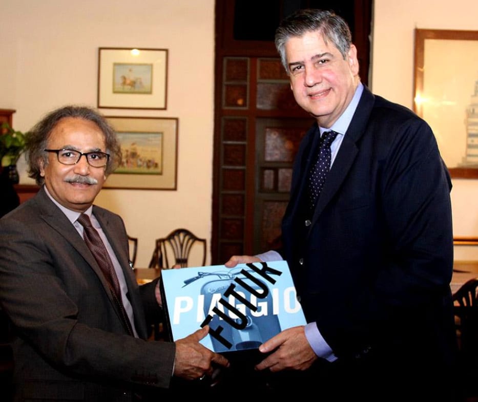 L’Ambasciatore d’Italia in Pakistan, Stefano Pontecorvo (a destra), consegna al Prof. Dr. Murtaza Jafri, Principal del National College of Arts (NCA) di Lahore il libro “Futur Piaggio”, che celebra i 130 anni di storia dell’azienda italiana.