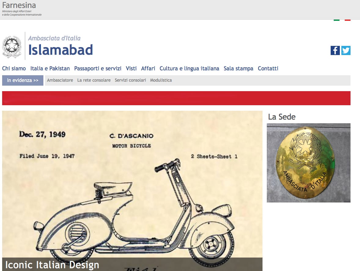 La home page del sito web dell’Ambasciata d’Italia a Islamabad, mostra un disegno storico di Vespa.