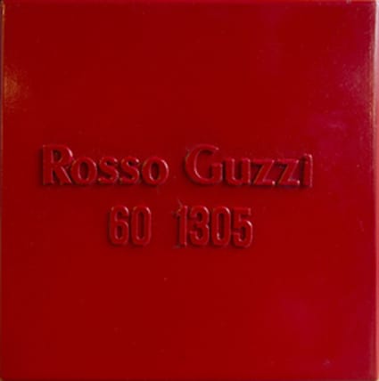 Alighiero Boetti, Rosso Guzzi, 1971. Pittura industriale su metallo, 25x25 cm Courtesy Gian Enzo Sperone. © Alighiero Boetti by SIAE 2018. Opera in due parti, che comprende Rosso Gilera. In mostra alla Reggia di Venaria.