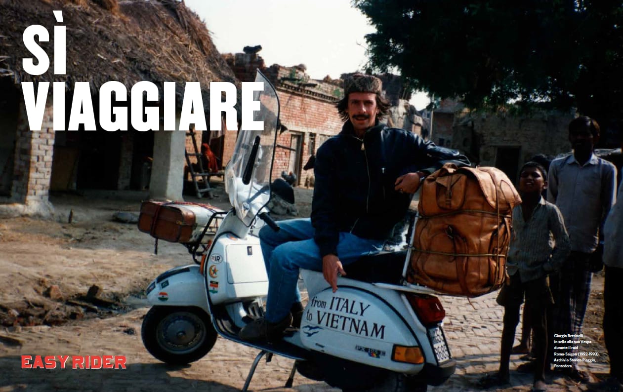 Dal catalogo della mostra, edito da Arthemisia Books: Giorgio Bettinelli in sella a Vespa PX, durante il raid Roma-Saigon (1992-1993), dall’Archivio Storico del Museo Piaggio, Pontedera (Pisa), che ha collaborato – tra gli altri – alla realizzazione della mostra (presente con la Vespa di Bettinelli, 1992), insieme con il Museo Moto Guzzi (presente con la Moto Guzzi V7 del 1969).