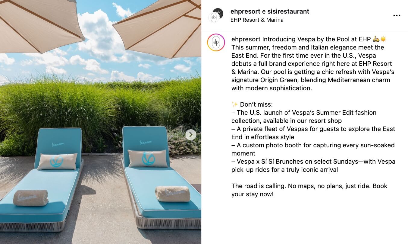 Feste estive a bordo piscina. Nelle domeniche 3 e 17 agosto, Vespa co-organizzerà due eventi speciali al Sí Sí, il ristorante open-air di EHP. Gli ospiti potranno richiedere un arrivo in Vespa per dare il via a un pomeriggio di cucina mediterranea, vista mare e musica dal vivo. Vespa by the Pool è più di una destinazione: è uno stato d’animo, dove spontaneità, stile e scoperta si intrecciano a ogni curva.