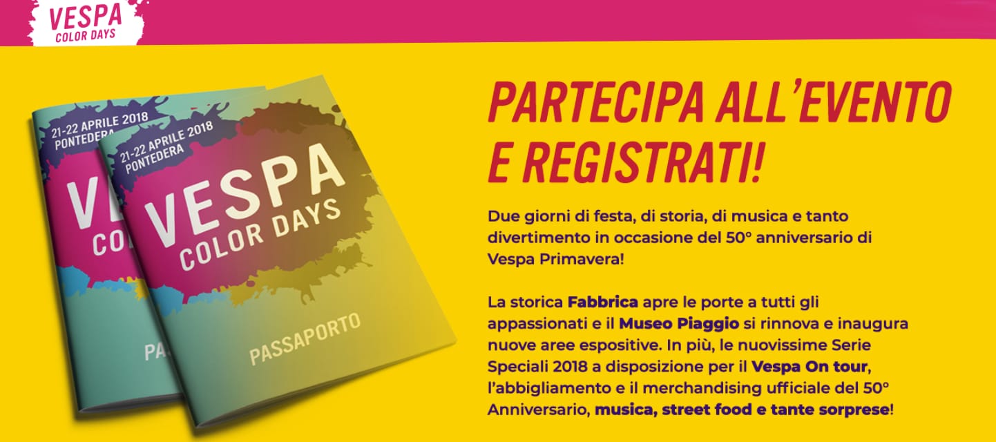 Sul sito web dedicato www.colordays.vespa.com o su www.vespa.com è possibile effettuare l’iscrizione online e conoscere tutti i dettagli dell’evento.