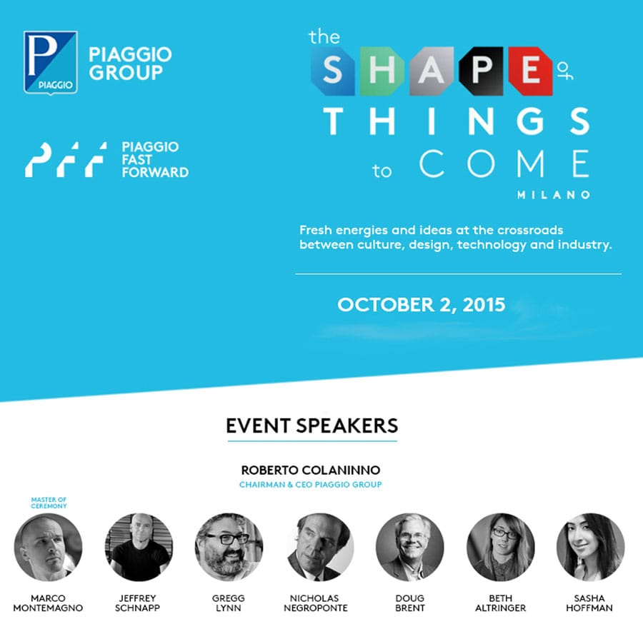 “The Shape of Things to Come” è stato il primo evento di presentazione del progetto PIAGGIO FAST FORWARD. Non poteva che svolgersi in Italia, dove il Gruppo Piaggio ha sede. E non poteva che avere davanti a sé – fisicamente a Milano, in streaming da ogni parte del mondo – un pubblico composto da migliaia di studenti universitari. Che sono il futuro del mondo, della società e del pensiero. Erano presenti Matteo Colaninno, Vicepresidente del Gruppo Piaggio, e Michele Colaninno, Amministratore Delegato e Direttore Generale del Gruppo Immsi (che controlla la maggioranza del Gruppo Piaggio), Consigliere di Amministrazione di Piaggio & C. S.p.A. e Chairman del Board of Directors della nuova società PFF.