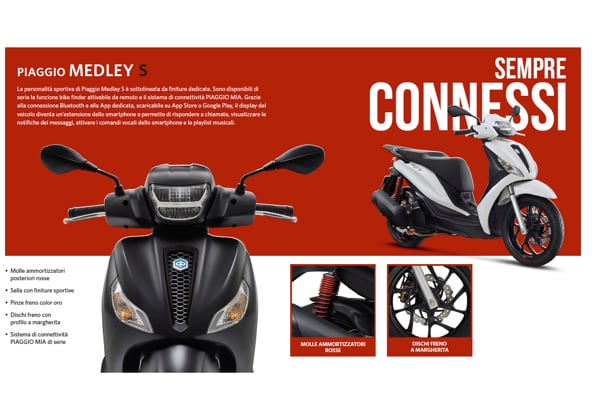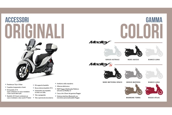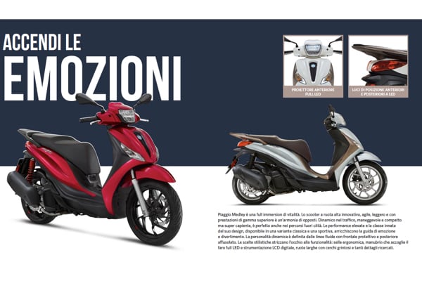 I vantaggi coinvolgono la gamma ruota alta, con soluzioni adatte a qualsiasi esigenza, includendo Piaggio Liberty, lo scooter entry level che offre eleganza, leggerezza e facilità di guida; Piaggio Medley - ricchissimo nell’allestimento e con l’ampio vano sottosella in grado di ospitare due caschi integrali - e Piaggio Beverly, il crossover perfetta sintesi tra un ‘ruota alta’ sportivo e un lussuoso GT. Promozioni attive anche sulla rinnovata gamma Piaggio MP3.