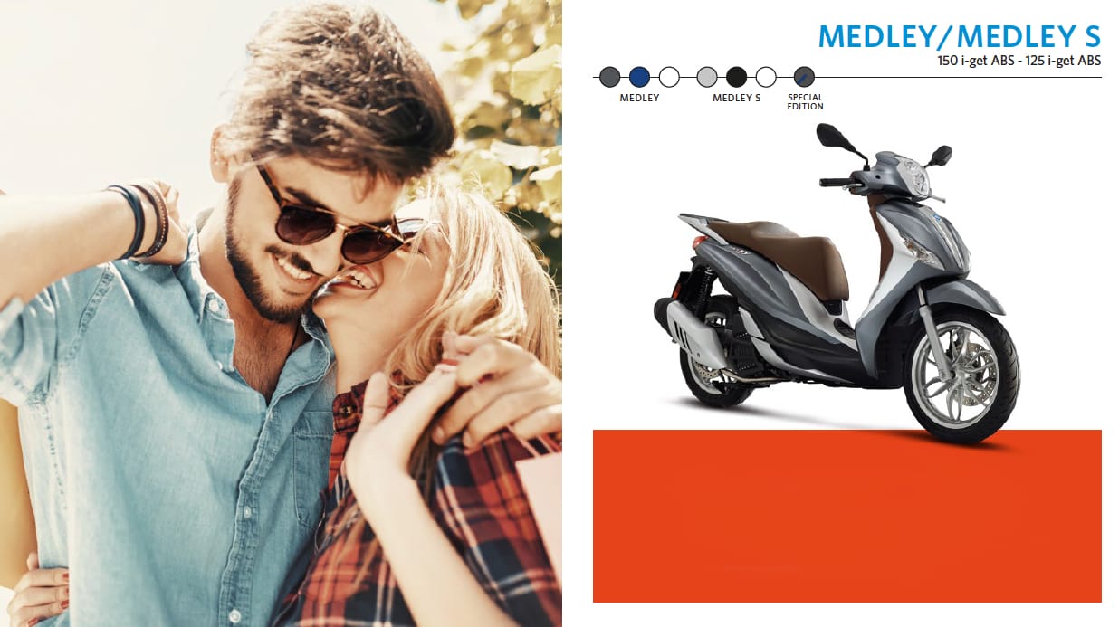 Tra le proposte Piaggio in grado di soddisfare qualsiasi esigenza di mobilità quotidiana, Medley è lo scooter che unisce i vantaggi di un ruota alta leggero con il comfort e la ricchezza di dotazioni di uno scooter di classe superiore. Per tutto il mese di aprile, tutti i modelli della gamma Medley sono offerti con il kit bauletto e parabrezza. E in più Medley è acquistabile con un finanziamento a interessi Zero (TAN 0,00% - TAEG max 4,13%) con prima rata a 30 giorni e rimborso fino a 24 mesi.