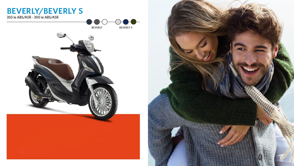Piaggio Beverly si contraddistingue per design accattivante, prestazioni brillanti e massima sicurezza non solo per le ruote di grande diametro, ma anche grazie a ciclistiche di stampo motociclistico. È disponibile in una gamma molto ricca: Beverly 300, un classico della mobilità urbana per sicurezza, affidabilità e generosità nelle prestazioni; Beverly 300 S, la declinazione più sportiva dal look giovanile e aggressivo; Beverly 300 e 350 by Police, versione speciale che nasce dall’unione di due eccellenze italiane; Beverly 350 SportTouring, l’ammiraglia della gamma che ha introdotto, per la prima volta al mondo su uno scooter, la coppia di sistemi di sicurezza ABS/ASR e un innovativo propulsore 350 dalle prestazioni record.
