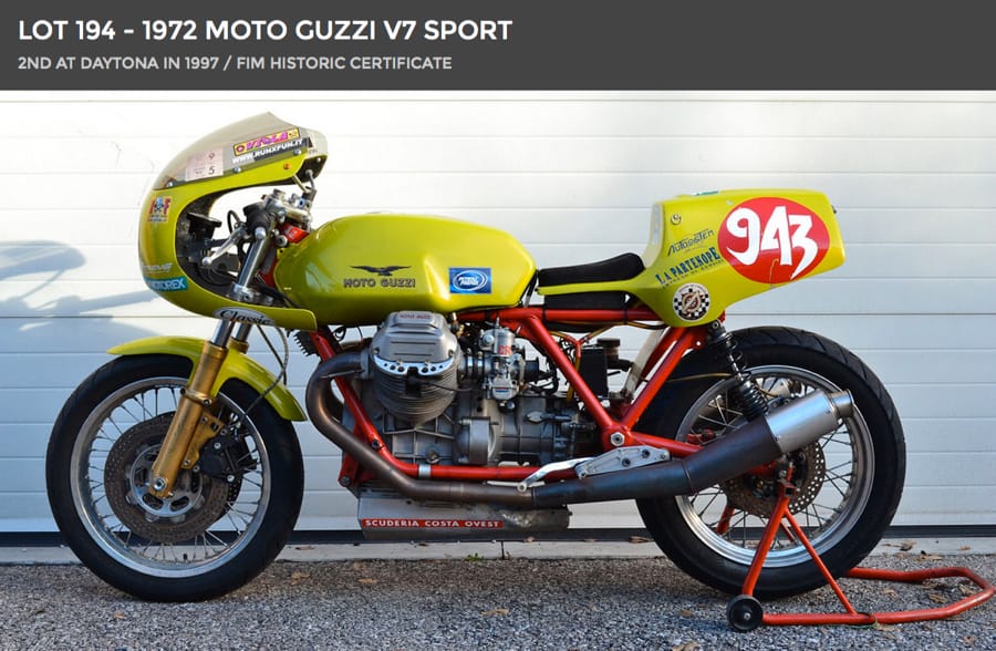 Altra Moto Guzzi superstar dell’asta è stata la Guzzi V7 Sport, originale, datata 1972, bike vincente a Daytona: 13,400 sterline.