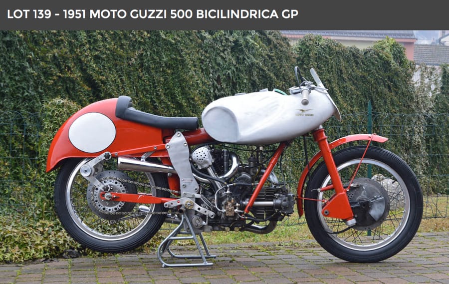 Le Moto Guzzi sono state molto richieste, in particolare i modelli sportivi e da competizione. Ha sorpreso in particolare la Moto Guzzi V8 500 GP del 1956 – con quotazione finale di 196,250 sterline – che è una perfetta riproduzione dell’originale, realizzata quindici anni fa da un ex tecnico di Mandello! Pare che il suono del suo motore sia musica d’angeli per gli appassionati.
