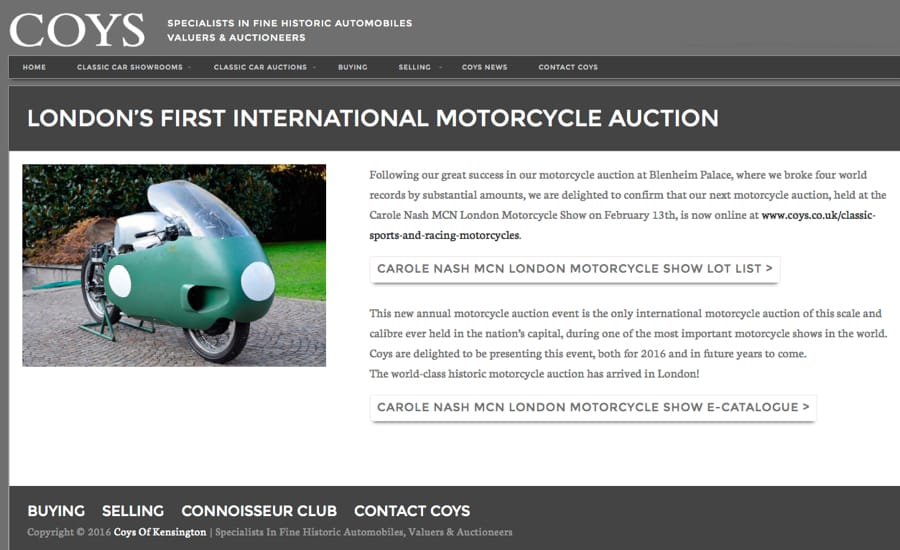 ALL’EVENTO INTERNAZIONALE DI COYS, CHE SI E’ TENUTO NELL’AMBITO DEL SALONE 2016 CAROLE NASH MCN LONDON MOTORCYCLE SHOW, SONO STATI BATTUTI SEI MODELLI VINTAGE MOTO GUZZI. QUOTAZIONE FINALE SUPER PER UNA MG 8 CILINDRI DEL 1956 (RIPRODUZIONE): OLTRE 240 MILA EURO!