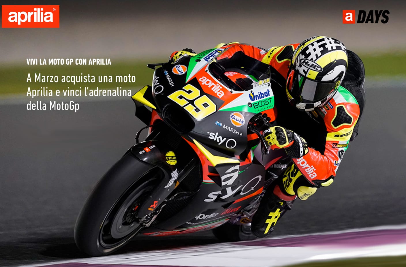 Gli Aprilia Days sottolineano infine l’indissolubile legame di uno dei marchi motociclistici più vincenti di tutti i tempi – 54 sono i titoli mondiali al suo attivo – con le competizioni. Una vera e propria vocazione sportiva che Aprilia intende condividere con gli tutti appassionati: chi acquisterà entro il 31 marzo un qualsiasi modello della gamma moto Aprilia concorrerà all’estrazione di esclusivi pass per vivere assieme al team Aprilia Racing una delle due tappe italiane del Campionato del Mondo MotoGP 2019.