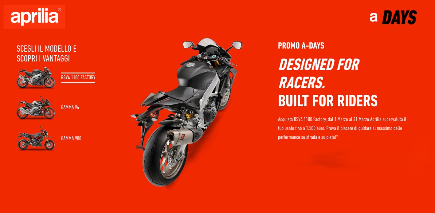 L’apertura straordinaria dei concessionari aderenti, per tutta la settimana dall’11 al 16 marzo, consentirà a tutti i motociclisti più appassionati di conoscere a fondo l’intera gamma Aprilia, nonché tutti i dettagli delle promozioni. La proposta commerciale coinvolge innanzitutto la straordinaria Aprilia RSV4 1100 Factory, ultimissima evoluzione della superbike di Noale spinta dal nuovo motore 4 cilindri a V da 217 cavalli. Sulla RSV4 più veloce, potente e leggera di sempre è attiva una speciale supervalutazione dell’usato che si tramuta in un vantaggio cliente di 1500 Euro.