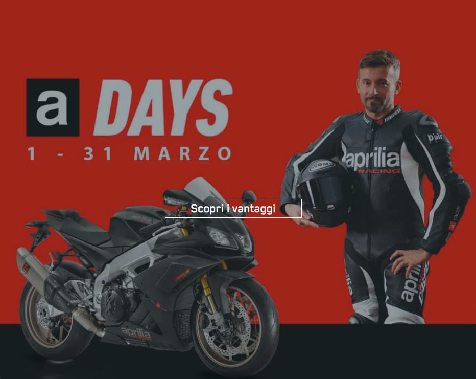 Per tutto il periodo degli Aprilia Days le facili e divertenti bicilindriche di 900 cc, la versatile Aprilia Shiver 900 e la fun bike per eccellenza, la Aprilia Dorsoduro 900, sono invece proposte con un vantaggio cliente pari a 500 Euro.