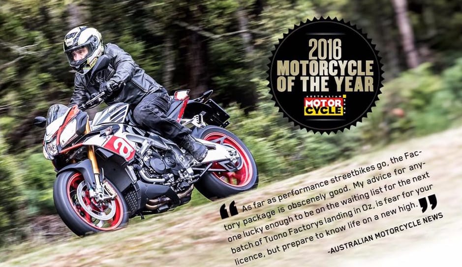 L’AUTOREVOLE RIVISTA DI SETTORE “AUSTRALIAN MOTORCYCLE NEWS” HA ASSEGNATO ALLA TUONO V4 1100 FACTORY – L’ULTIMA E PIU’ SPETTACOLARE EVOLUZIONE DELLA DINASTIA DI NAKED SPORTIVE DI CASA APRILIA – IL TITOLO “MOTY AWARD 2016”. IL REPORTAGE (FIRMATO DA PAUL YOUNG, FOTO DI MARK DADSWELL), PUBBLICATO SUL MAGAZINE (YEARBOOK EDITION), RACCONTA LA SFIDA FINALE – COMBATTUTA LUNGO LA SPETTACOLARE GREAT OCEAN ROAD – TRA LE “EIGHT WONDERS”: OTTO GRANDI MOTO DI MARCHI INTERNAZIONALI, BEST NOVITA’ DELL’ANNO E FINALISTE. HA VINTO L’EMOZIONANTE ITALIANA. LA SFIDA 2017 E’ GIA’ COMINCIATA.